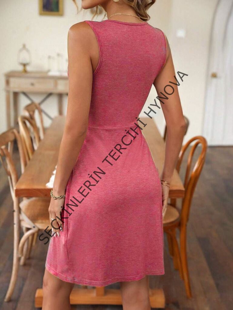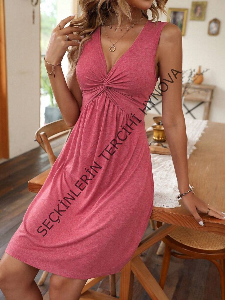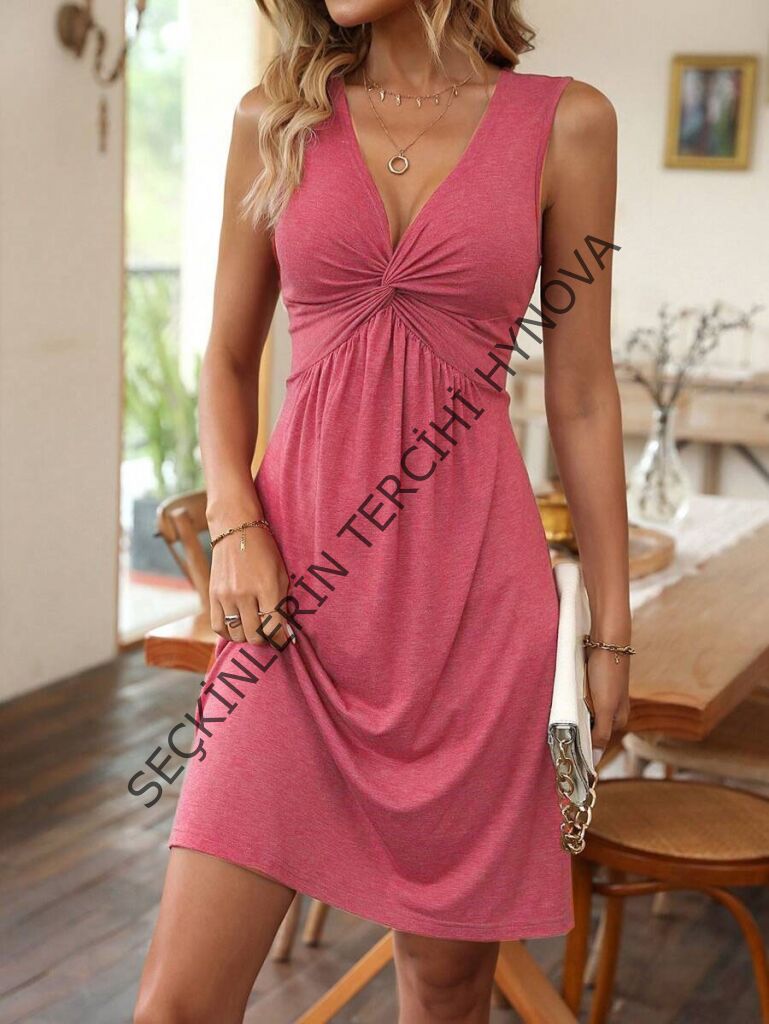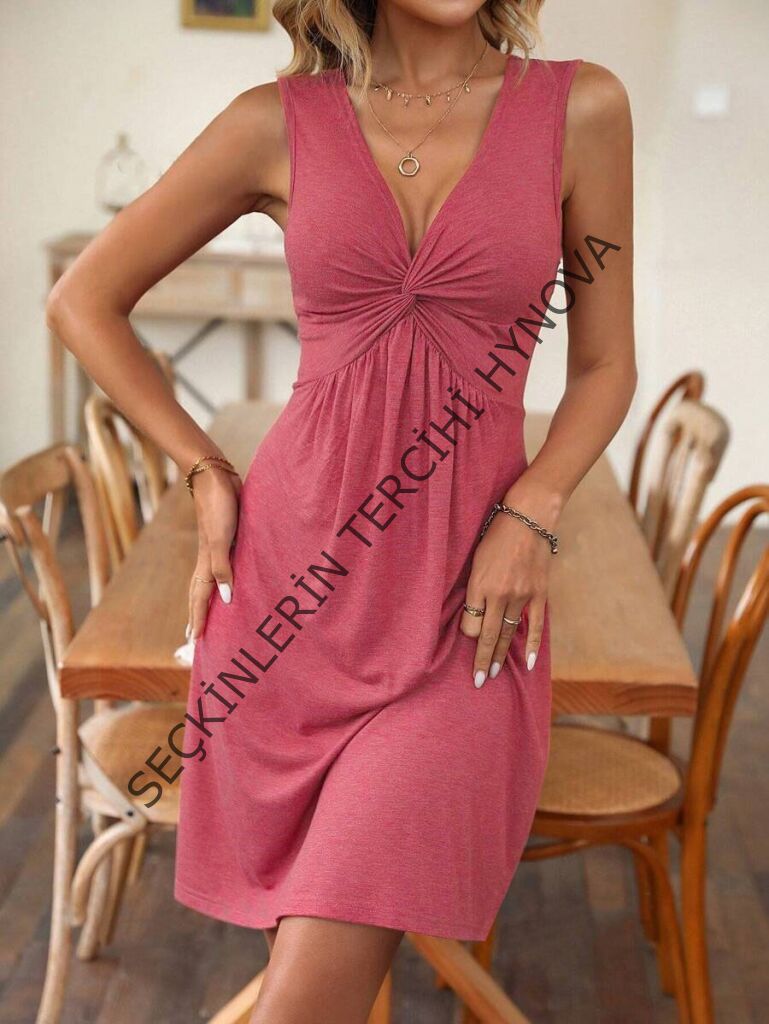 Kadın Askılı V Yakalı önü Düğüm Detaylı Viskon Elbise