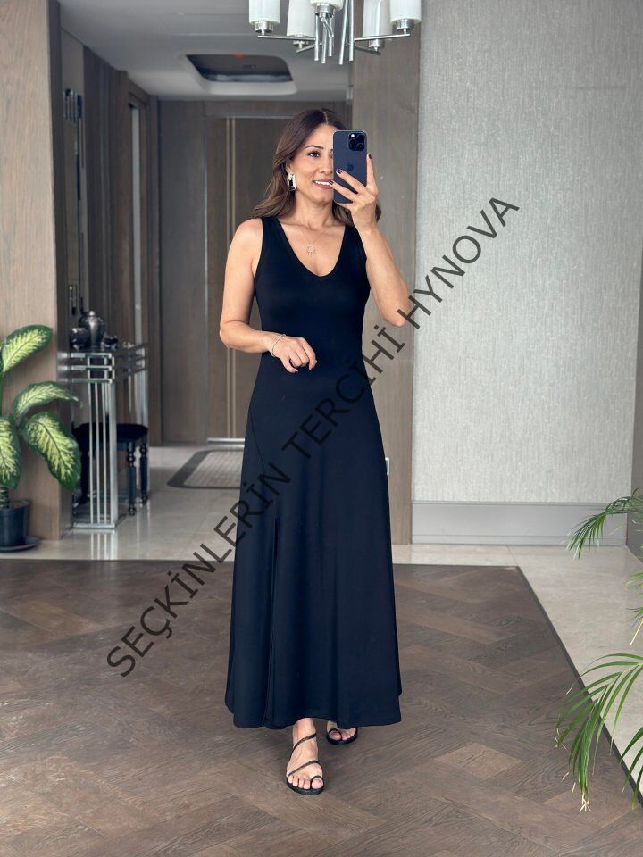 Kadın Askılı V Yakalı Yırtmaçlı Viskon Elbise