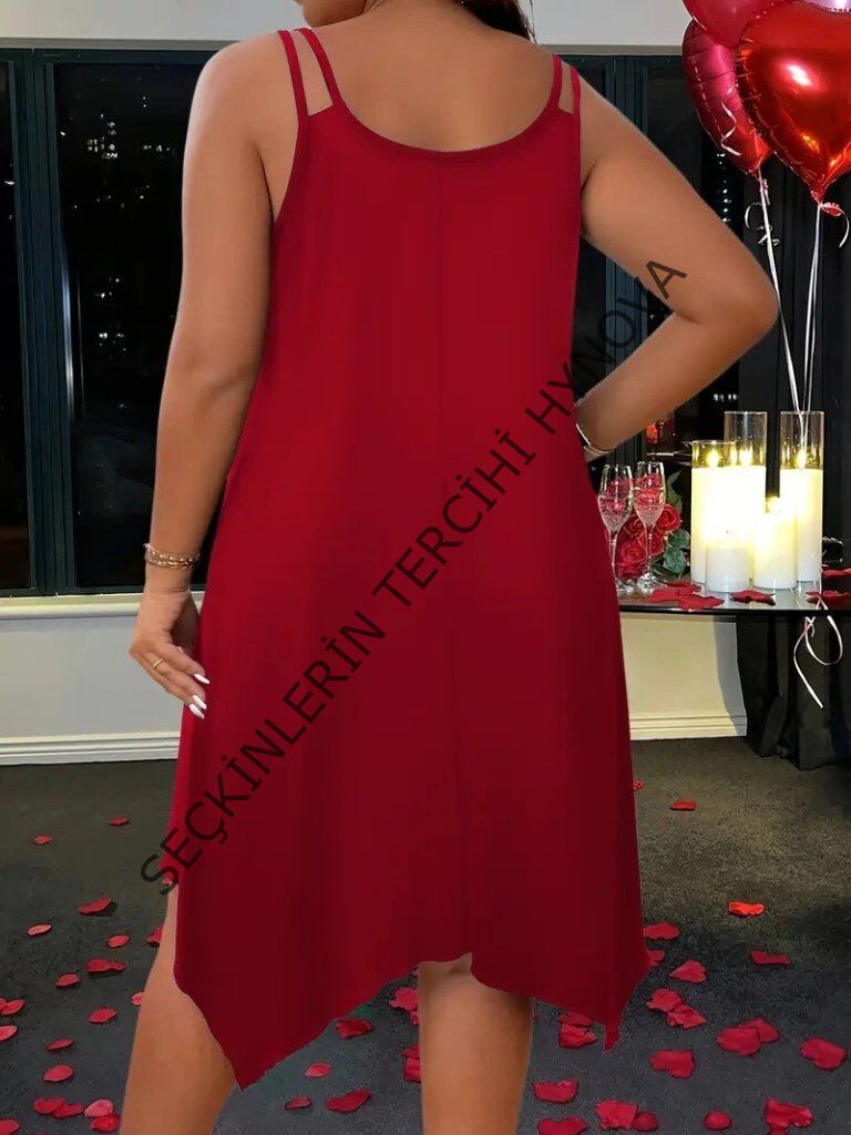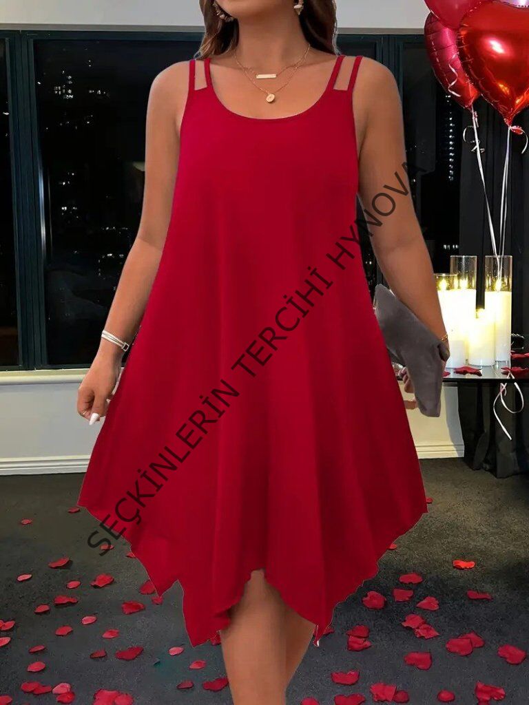 Kadın Askılı Yuvarlak Asimetrik Kesim Detaylı Viskon Elbise