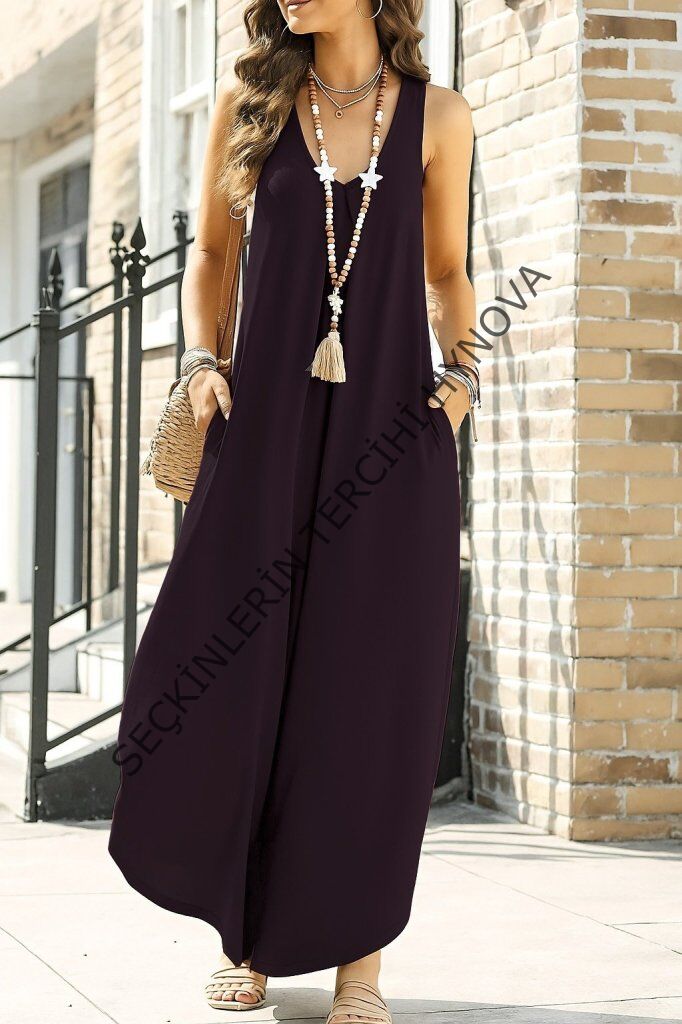 Kadın Askılı Yuvarlak Yaka Cepli Salaş Uzun Viskon Tulum