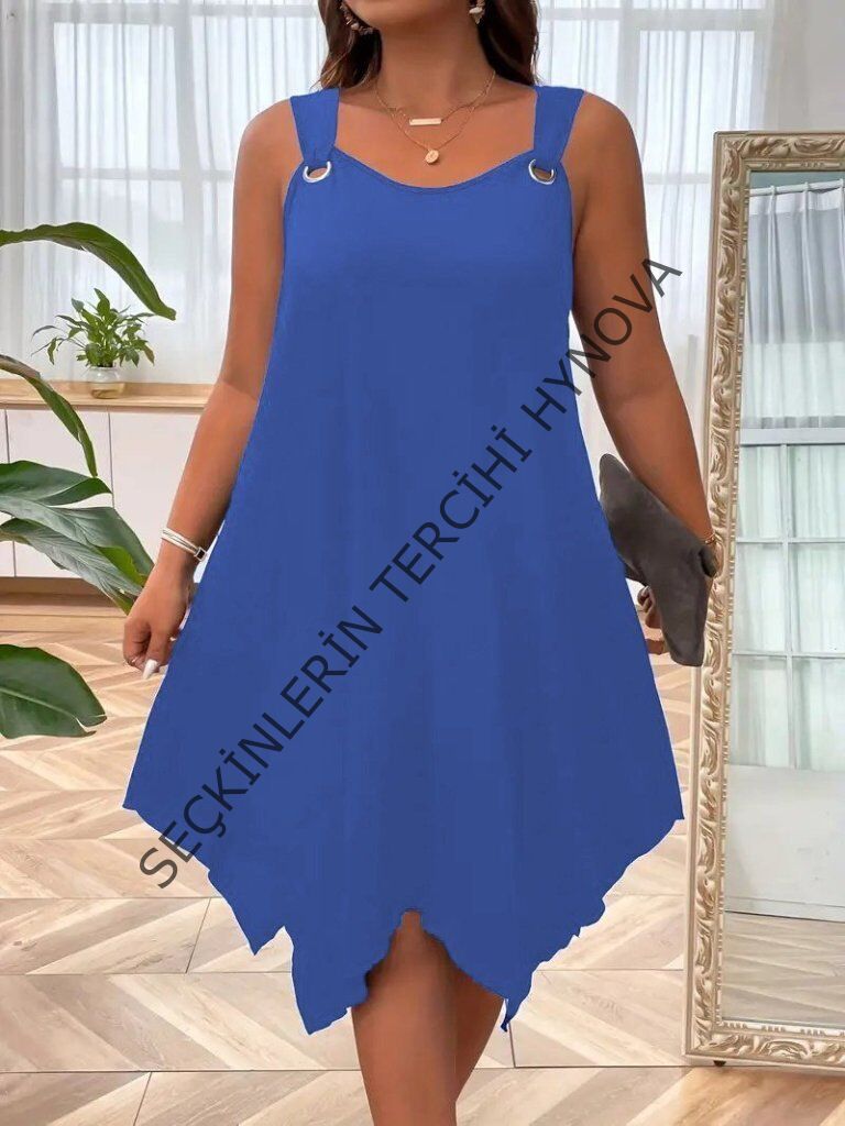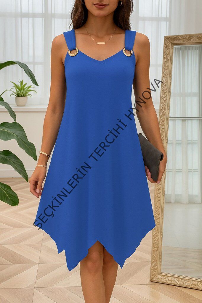 Kadın Askılı Yuvarlak Yaka Kuş Gözü Detaylı Asimetrik Viskon Elbise