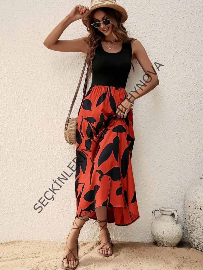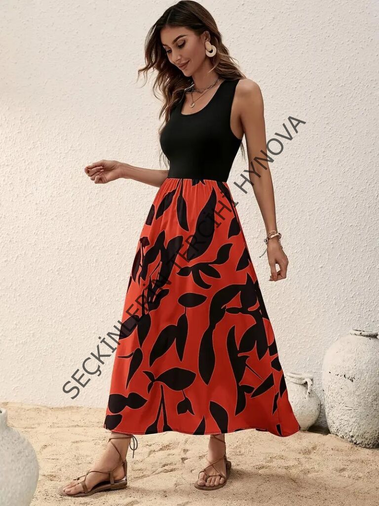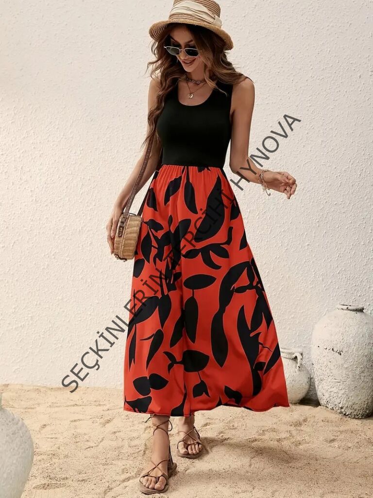 Kadın Askılı Yuvarlak Yaka üst Viskon Alt Desenli Uzun Süprem Elbise