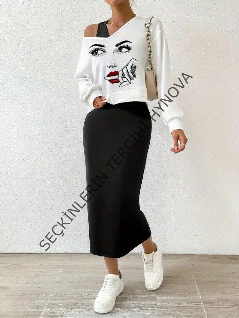 Kadın Askılı Yuvarlak Yaka Viskon Iki Iplik Elbise Ve V Yakalı Bluz Ikili Takım