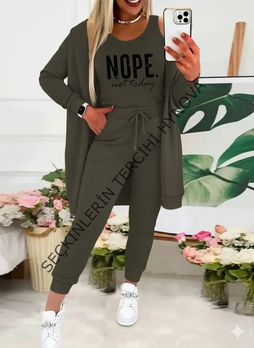 Kadın Askılı Yuvarlak Yaka Yazılı Viskon Iki Iplik Bluz Ceket Ve Pantolon 3lü Takım