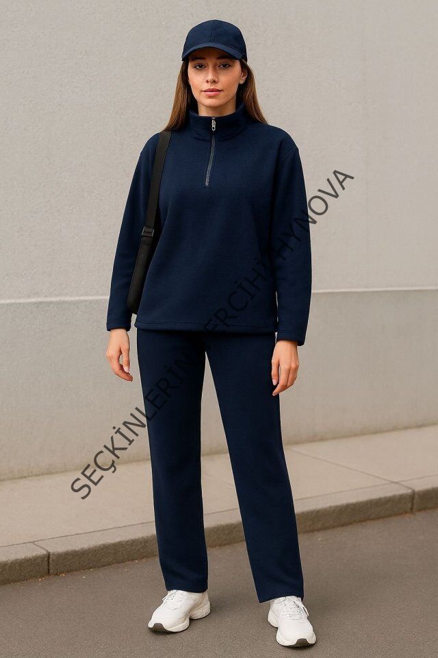 Kadın Balıkçı Yaka Fermuar Detay Polar Sweat Ve Pantolon Ikili Takım