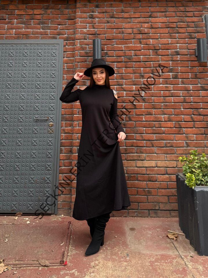 Kadın Balıkçı Yaka Omuzlardan Açık Uzun Kollu Janjan Krep Elbise