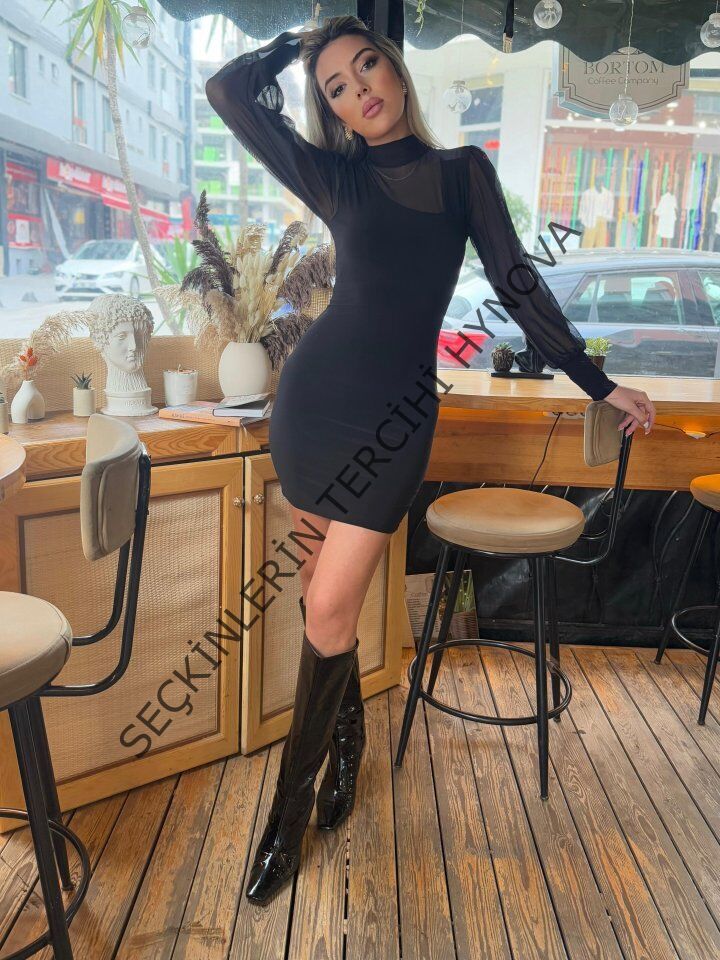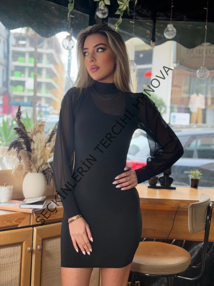 Kadın Balıkçı Yaka Transparan Detay Fırsat ürün Sandy Kumaş Mini Elbise