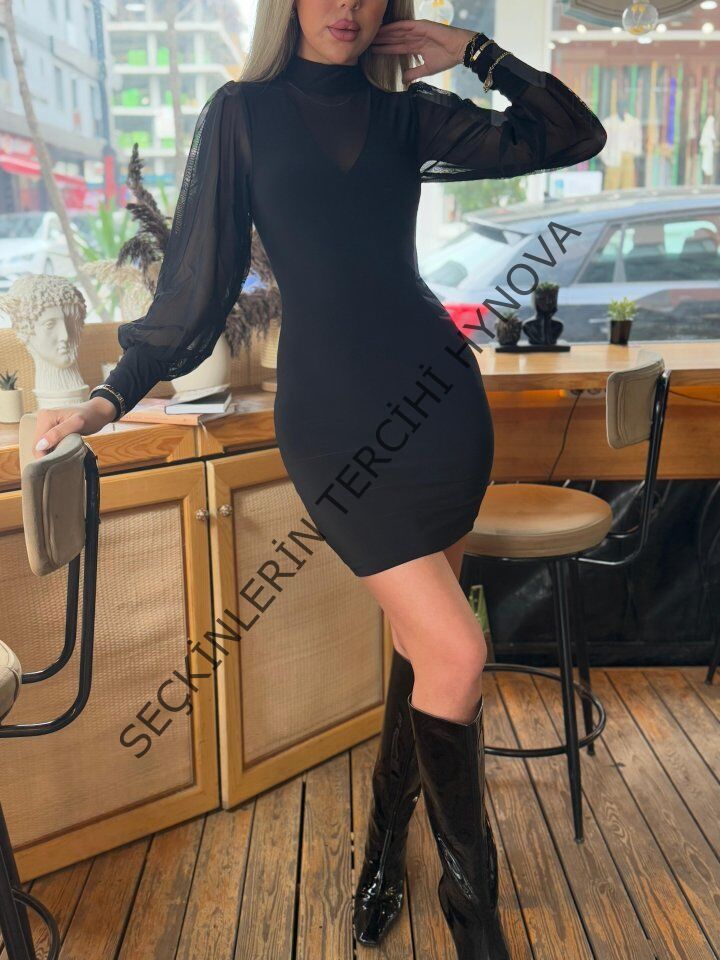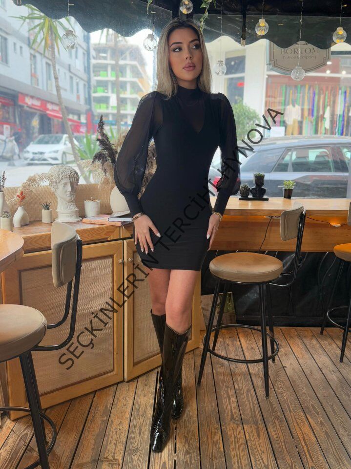 Kadın Balıkçı Yaka Transparan Detay Fırsat ürün Sandy Kumaş Mini Elbise