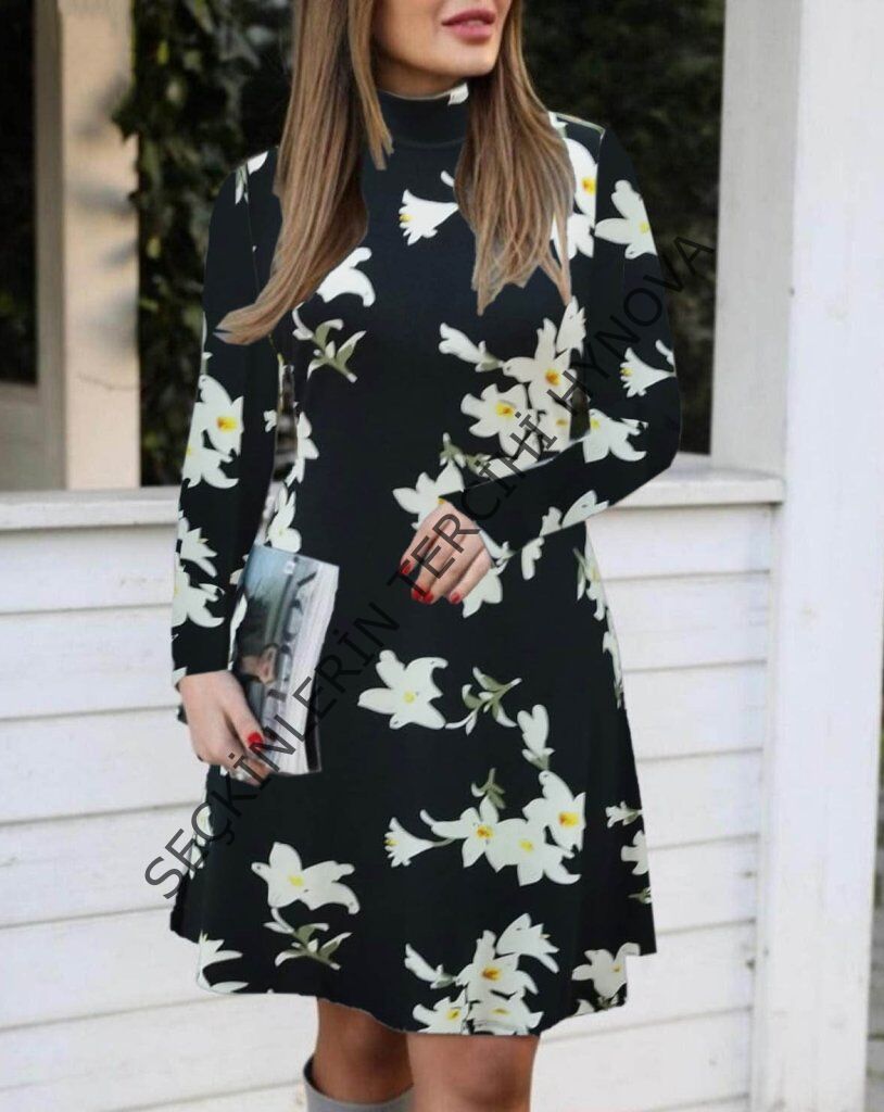 Kadın Balıkçı Yaka Uzun Kollu çiçek Desenli Krep Elbise