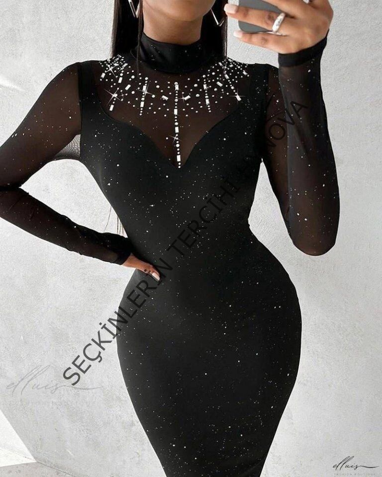 Kadın Balıkçı Yaka Uzun Kollu Rahat Param Ve Taş Detay Midi Boy Elbise
