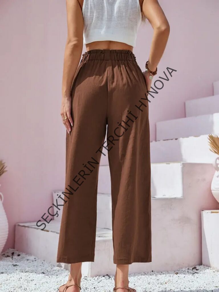 Kadın Bel Büzgü Ve Düğme Detay Kısa Geniş Paça Keten Pantolon
