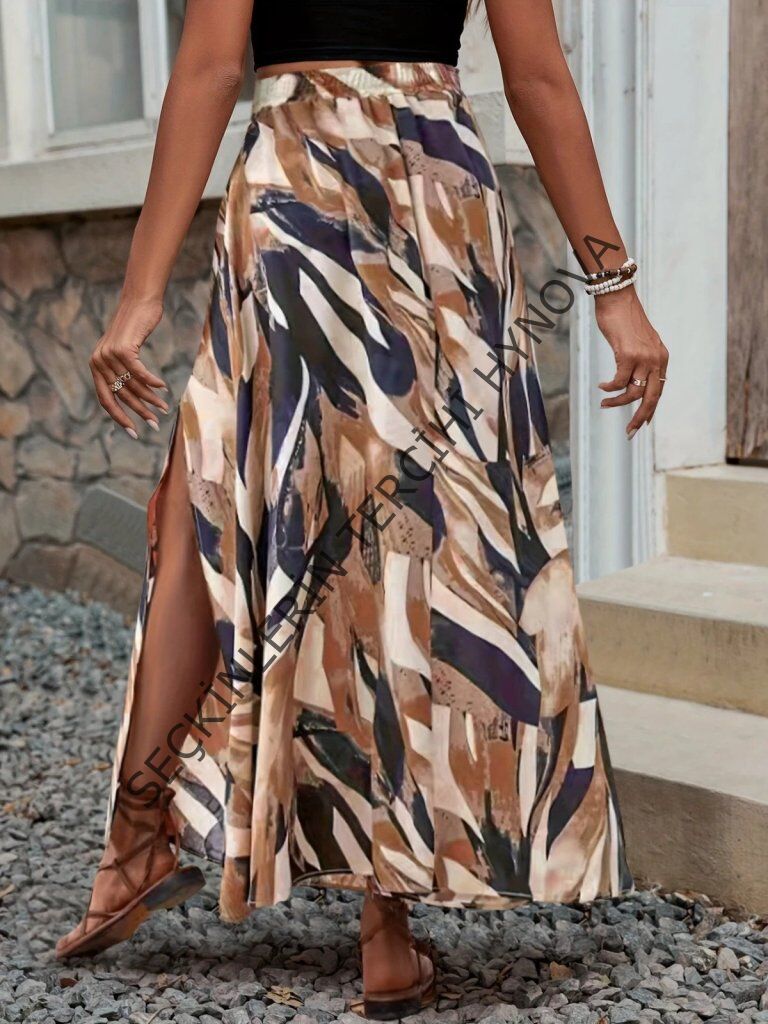Kadın Beli Büzgülü Yandan Yırtmaçlı Desenli Süprem Etek