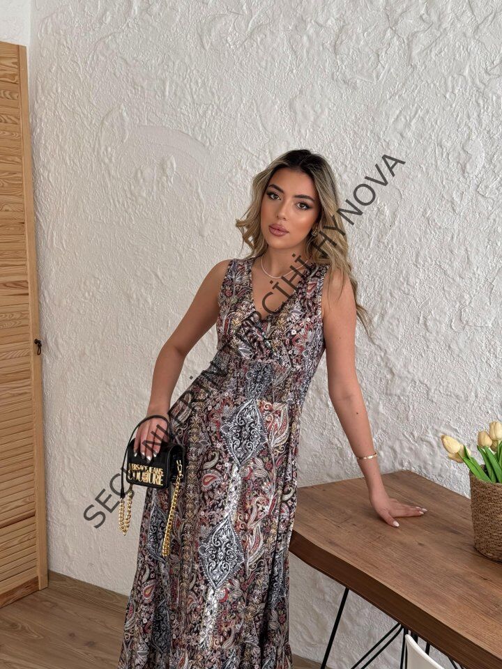 Kadın Beli Gipeli Etnik Desen Sıfır Kol Süprem Elbise