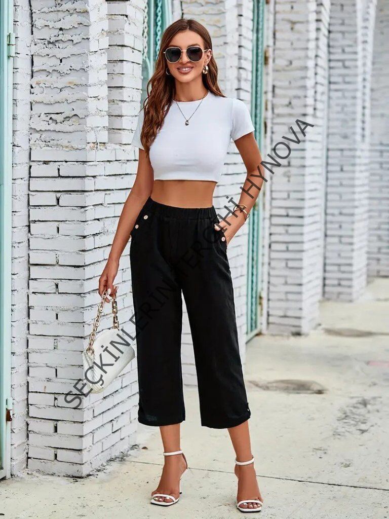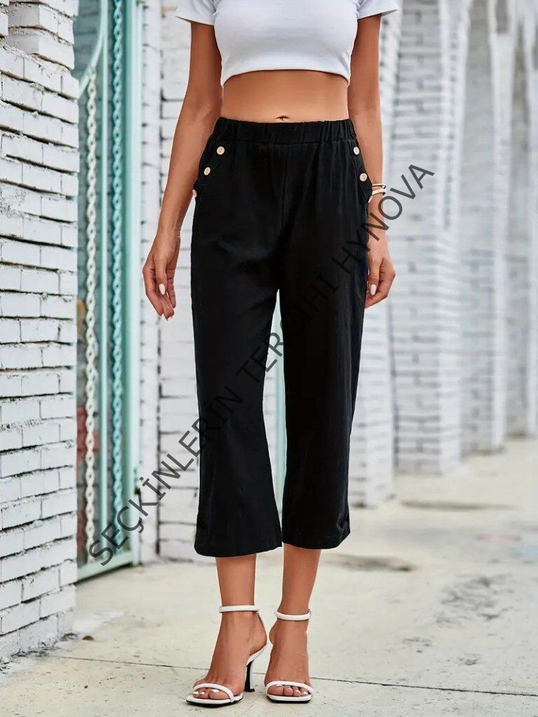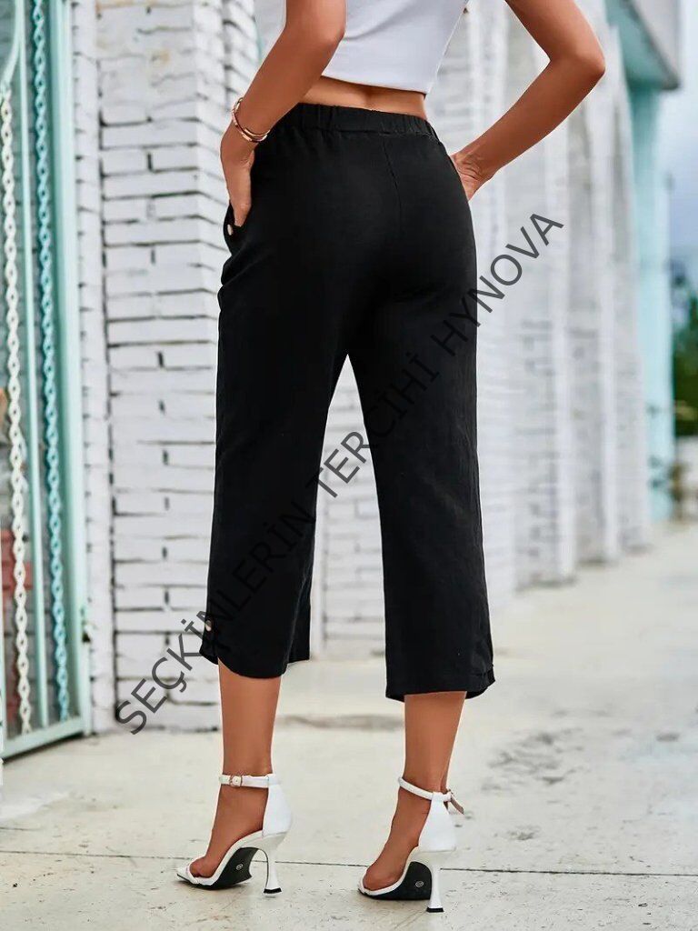 Kadın Beli Lastikli Düğme Ve Cep Detaylı Kapri Ithal Keten Pantolon