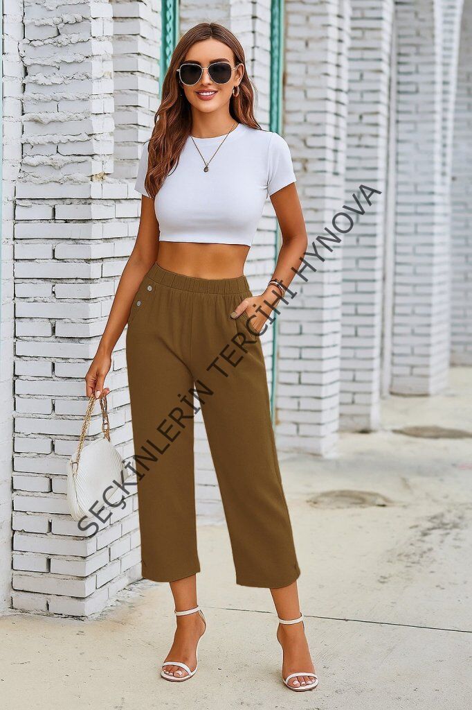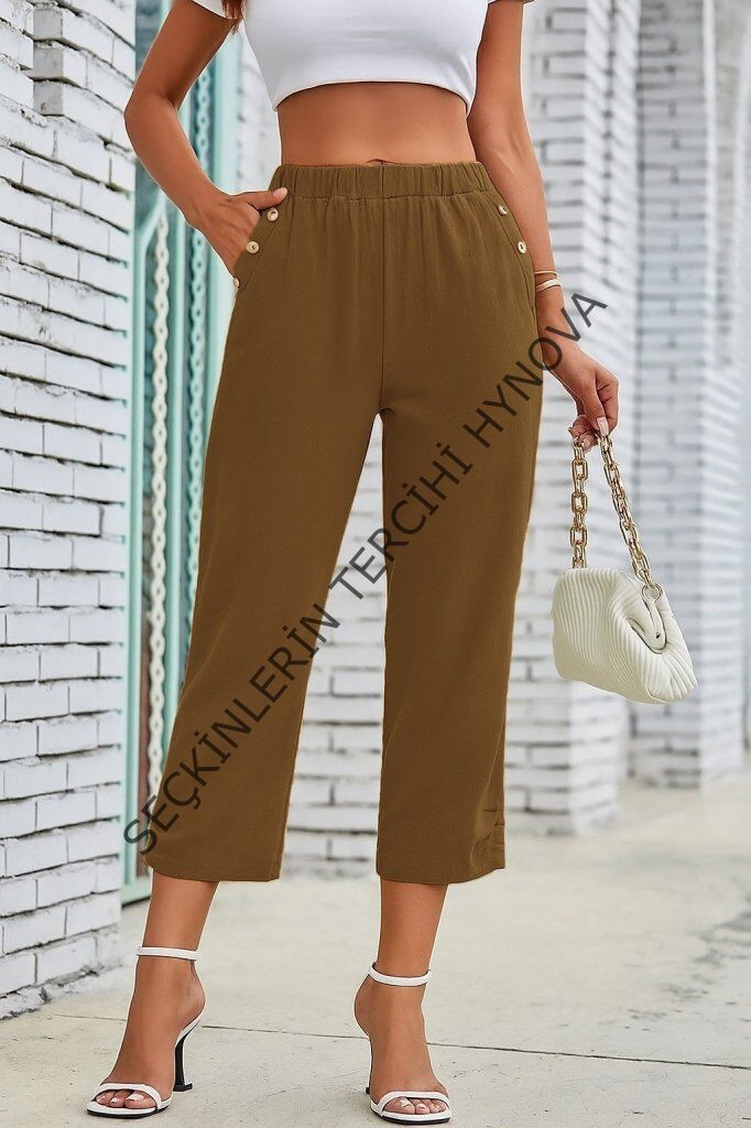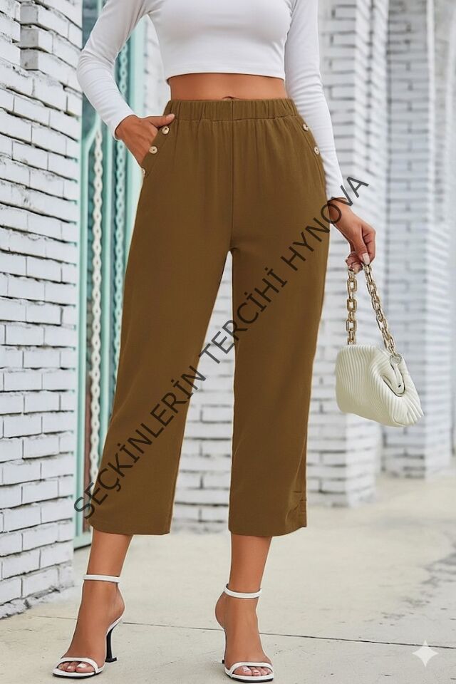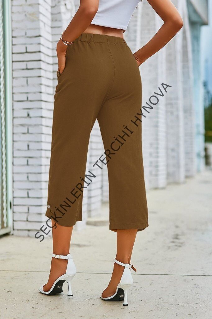 Kadın Beli Lastikli Düğme Ve Cep Detaylı Kapri Ithal Keten Pantolon