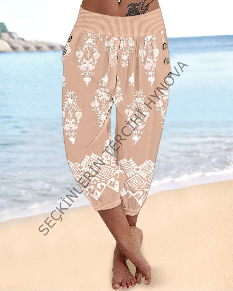 Kadın Beli Lastikli Etnik Desenli Kapri Süprem Pantolon