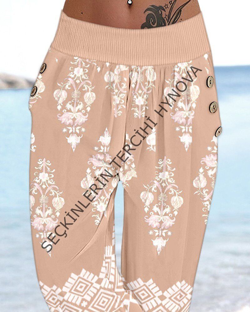 Kadın Beli Lastikli Etnik Desenli Kapri Süprem Pantolon