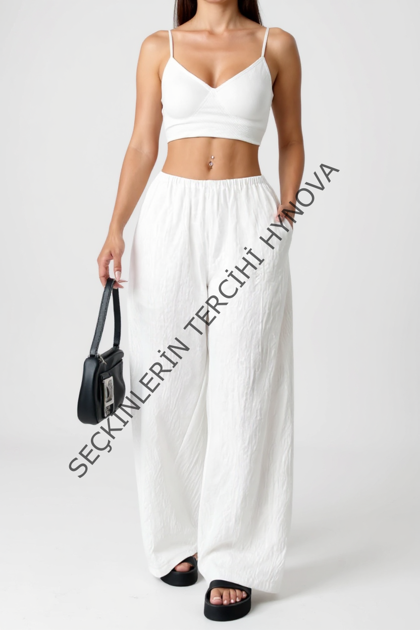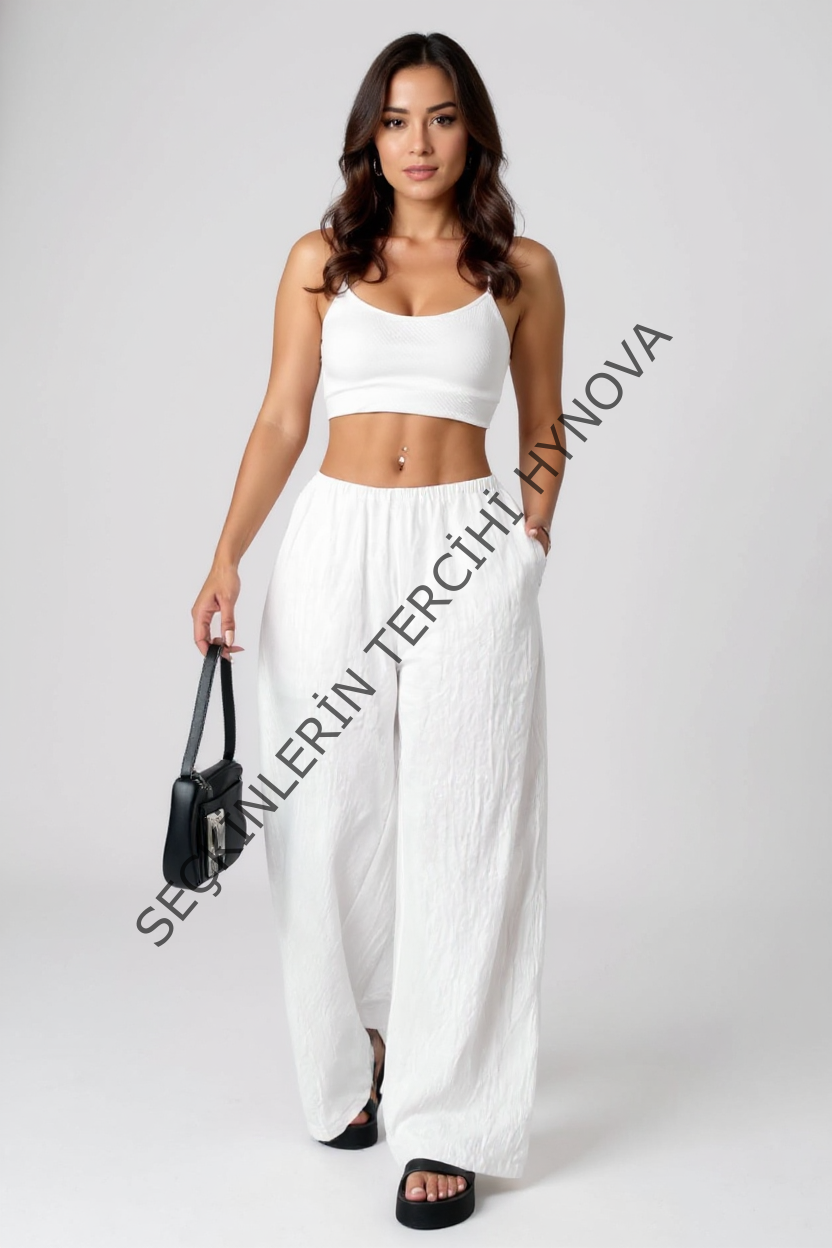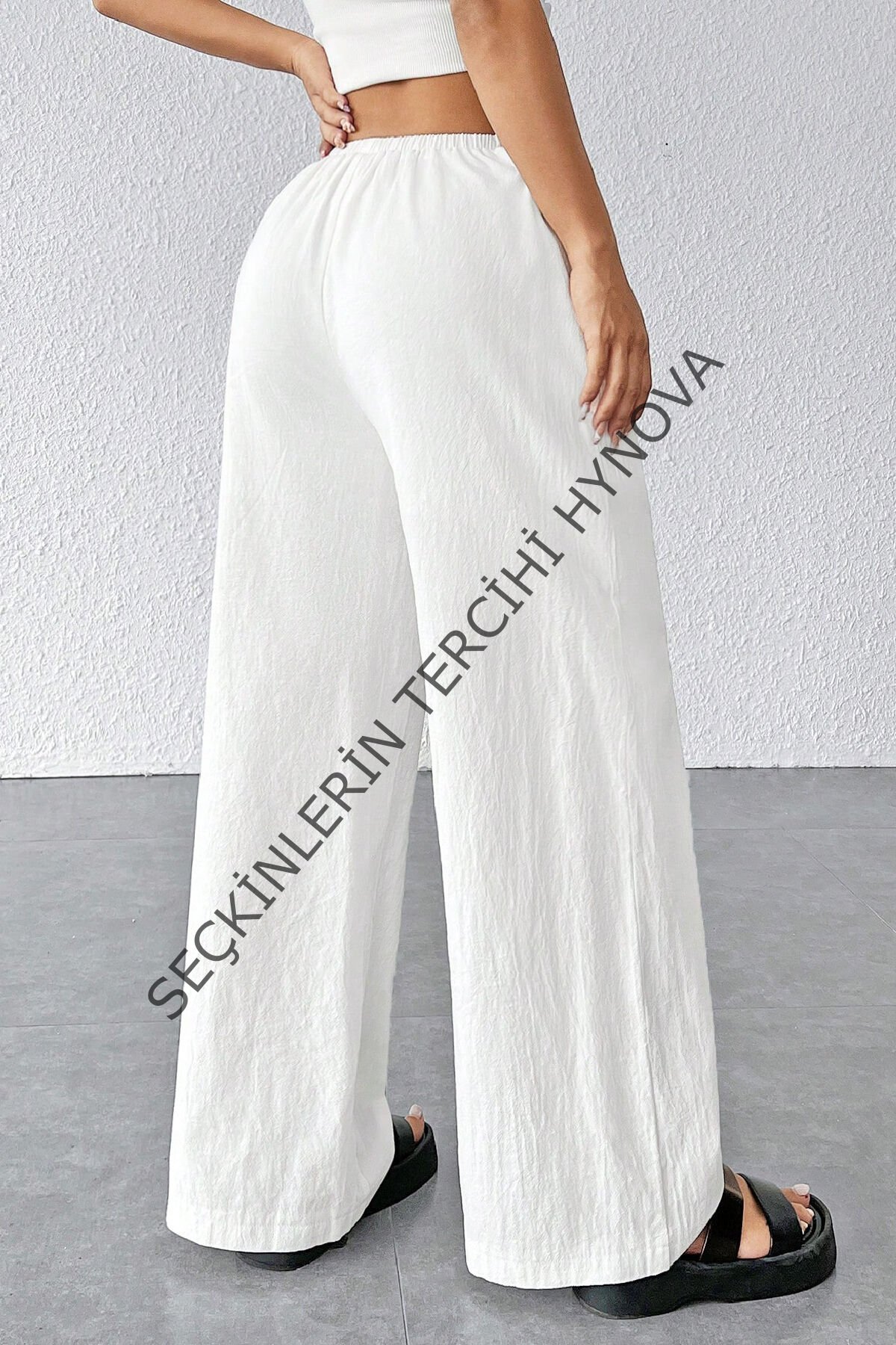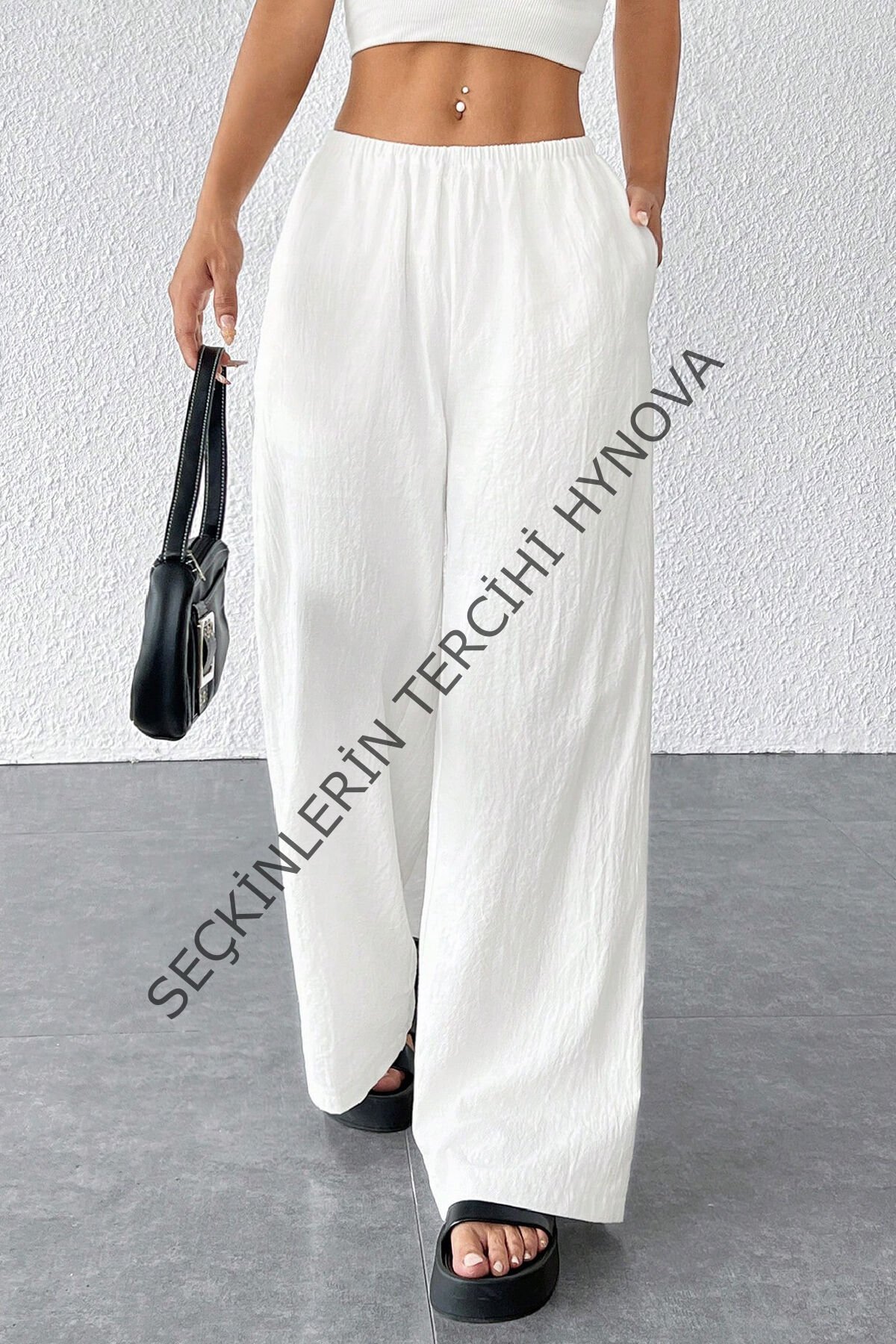 - Şıklık ve rahatlığı bir arada sunan kadın beyaz bol kesim geniş paçalı çift cepli dökümlü pantolon, günlük kullanım ve özel kombinler için ideal bir seçimdir.