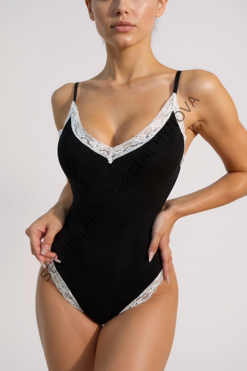 Kadın Beyaz Dantel Işlemeli Siyah Tulum Gecelik – Modern ve Şık Tasarım
