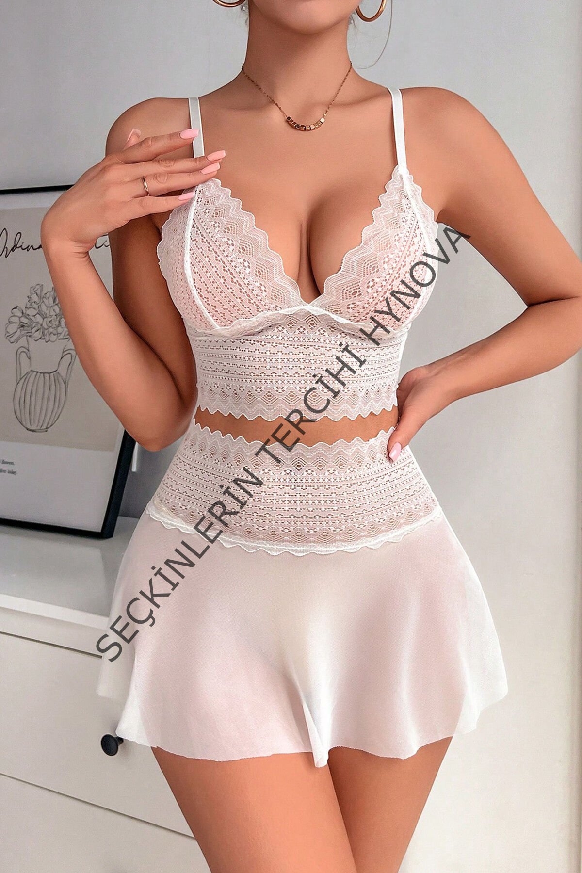 - Beyaz Beli Dantelli Tül Etek ve Braletli Gecelik Takımı