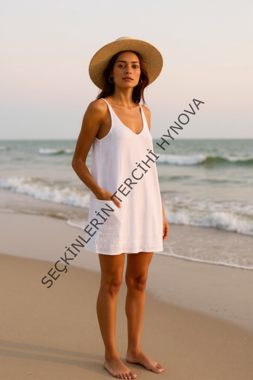 Hafif ve nefes alan kumaşı ile sıcak yaz günlerinde serinlik sağlayan cepli plaj elbisesi, plajda bikini veya mayo üzerine rahatlıkla giyilebileceği gibi, günlük hayatta da sandalet veya spor ayakkabı ile kombinlenerek modern bir tarz oluşturur. Mini boyu sayesinde genç ve dinamik bir görünüm sunarken, beyaz rengin sadeliği ile farklı aksesuarlarla kolayca uyum sağlar.