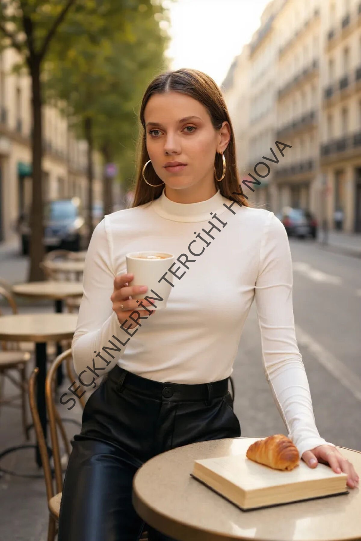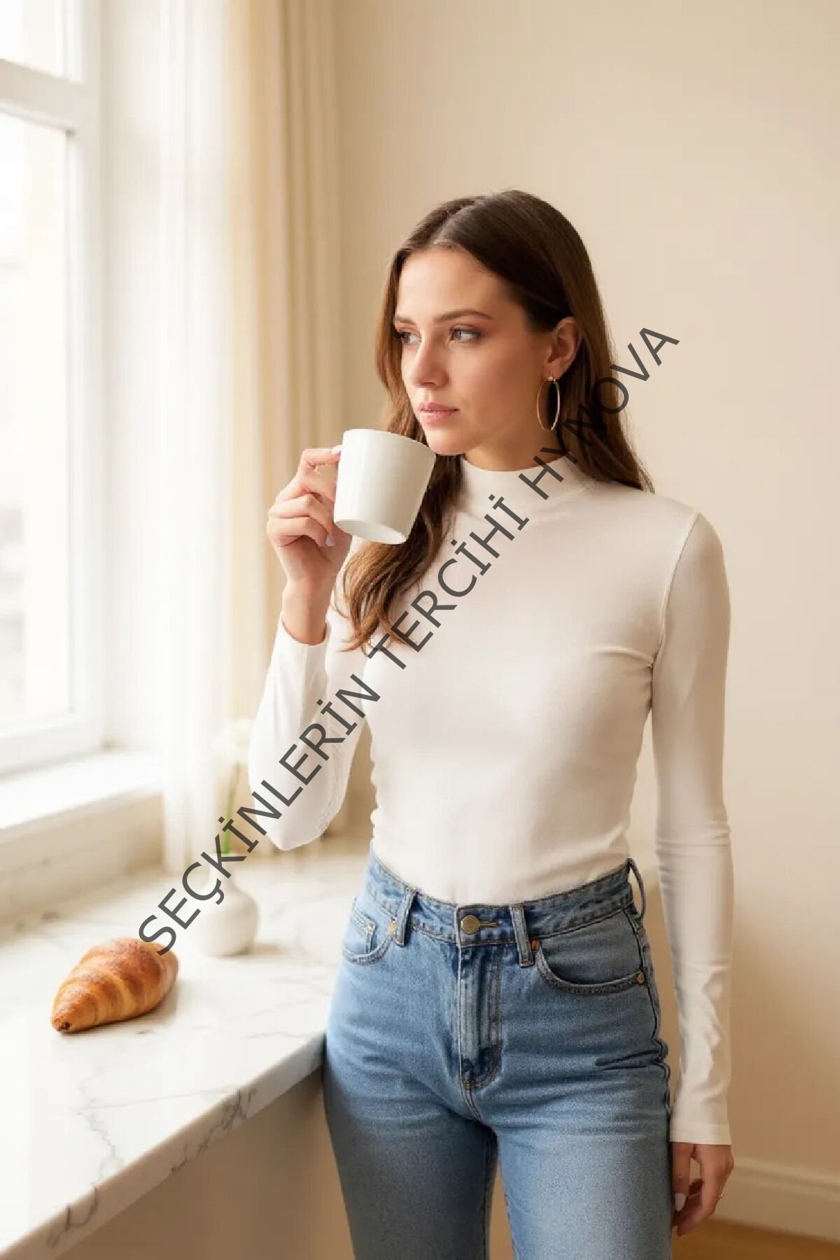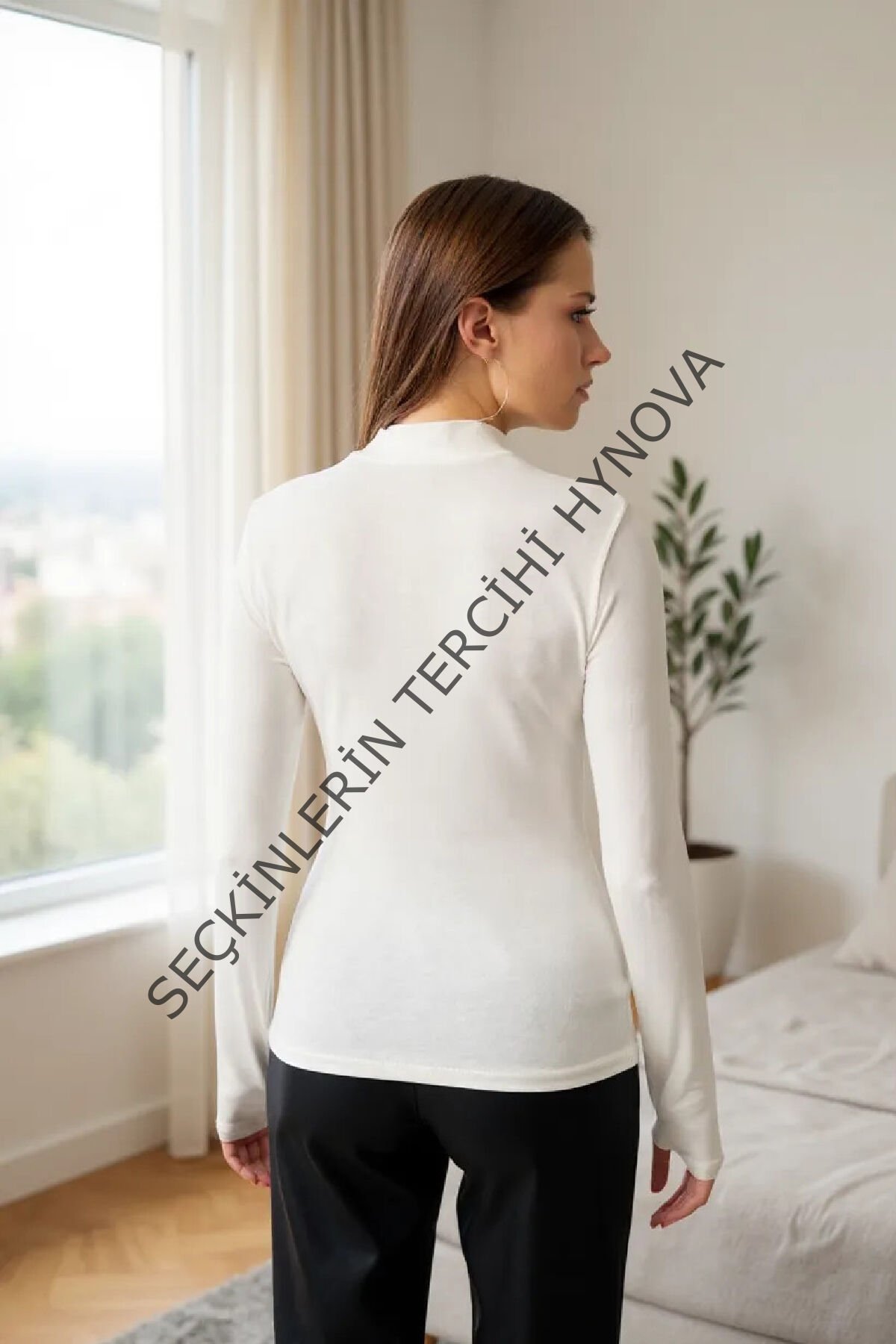 Kadın Beyaz Parmak Detaylı Esnek Uzun Kollu Body