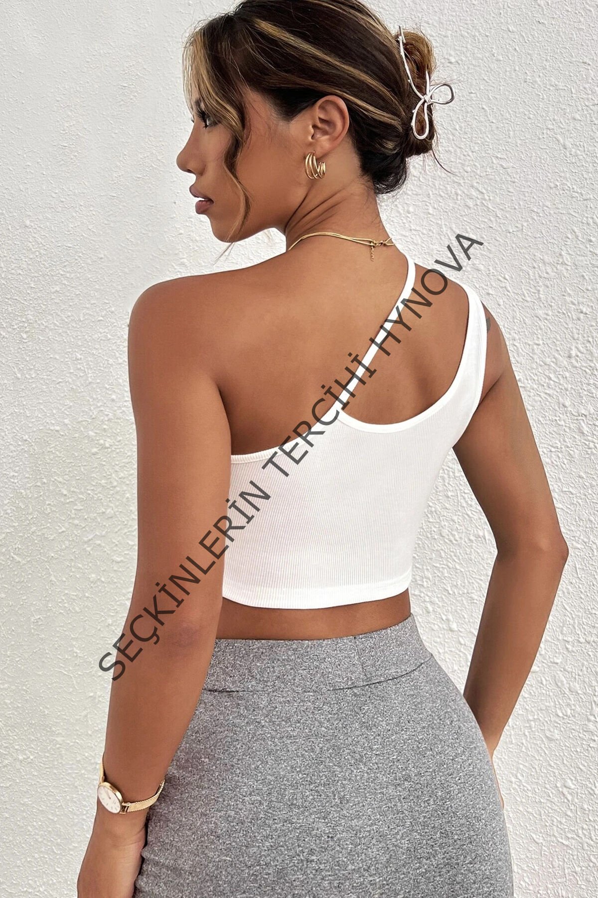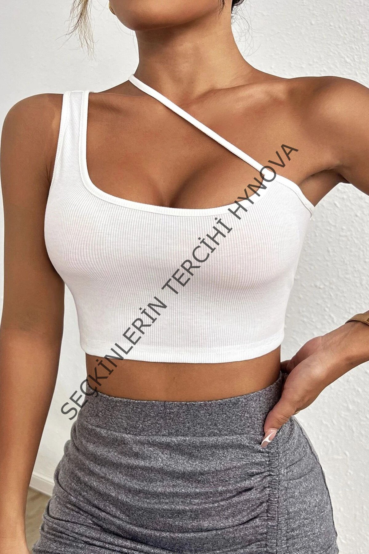 Kadın Beyaz Tek Omuzlu Çapraz Askılı Crop Top Büstiyer