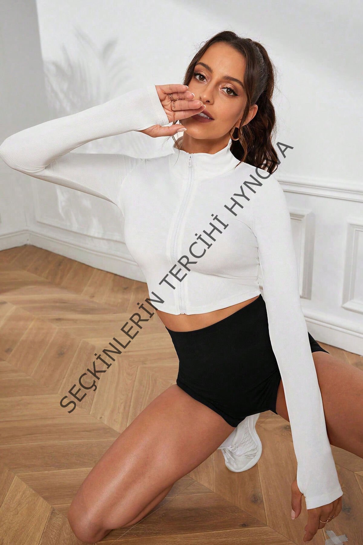 Kadın Beyaz Uzun Kol Fermuarlı Parmak Geçme Detaylı Dik Yaka Crop Top Bluz