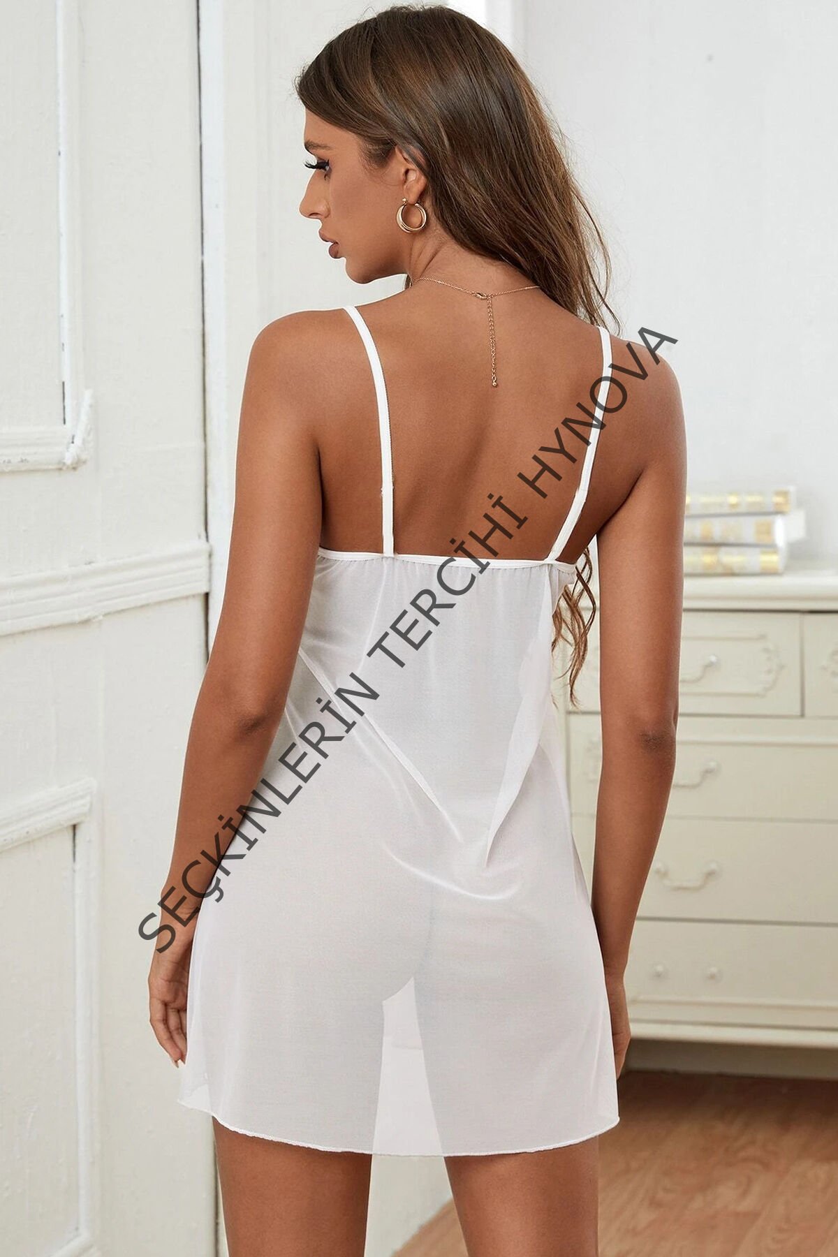 Kadın Beyaz V Yaka Dantel Detaylı Tül Gecelik – Modern ve Şık Tasarım