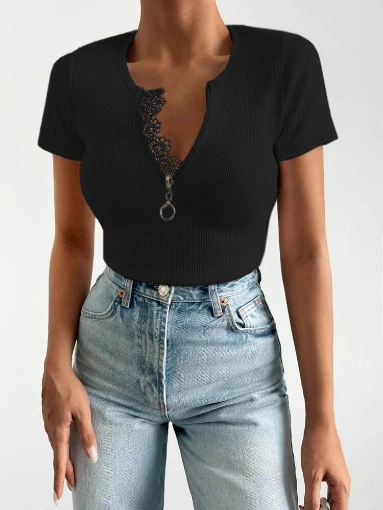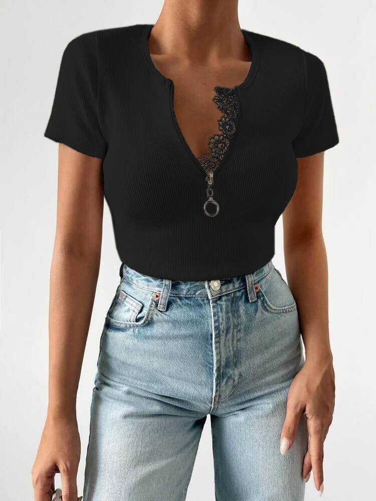 Kadın Beyaz Yaka Dantel Ve Fermuarlı Kaşkorse Bluz