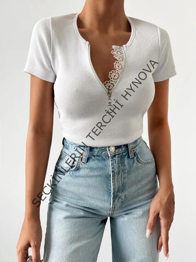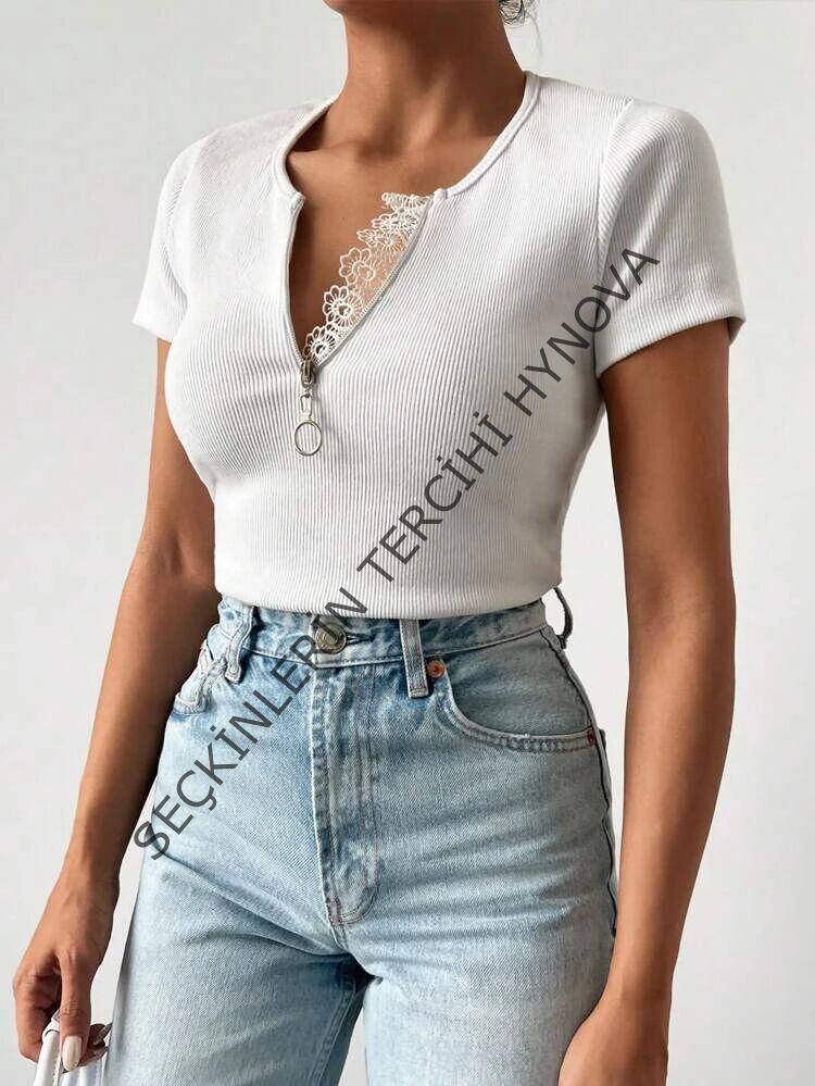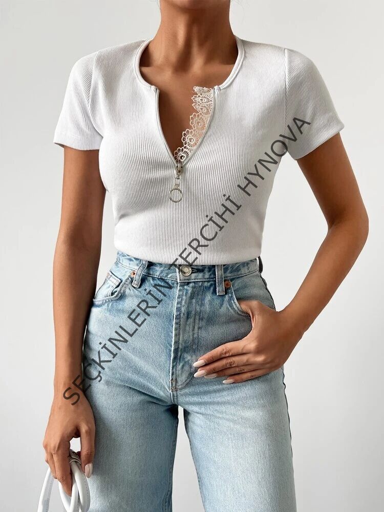 Kadın Beyaz Yaka Dantel Ve Fermuarlı Kaşkorse Bluz