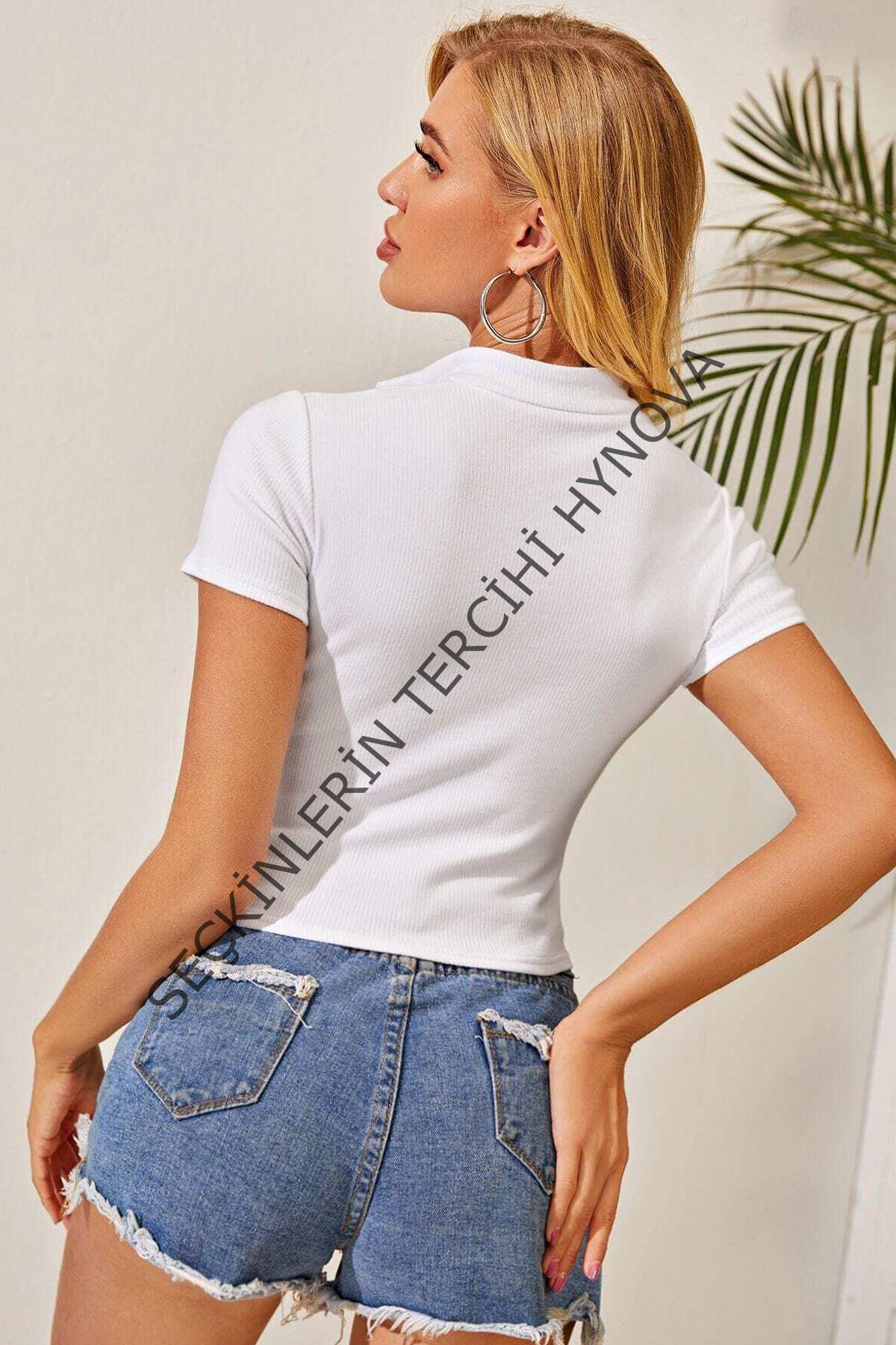 Kadın Beyaz Yarım Fermuarlı ve Kısa Kollu Crop Top Bluz – Şık, Rahat ve Kolay Kombinlenebilir