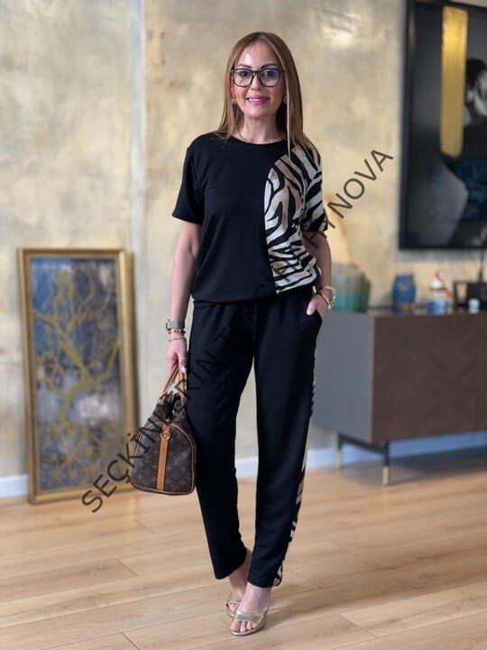 Kadın Bisiklet Yaka Kısa Kol Leopar Desen Bluz Ve Pantolon Ikili Takım