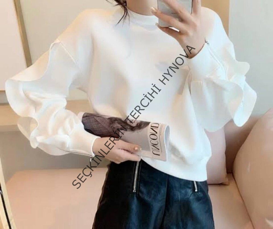 Kadın Bisiklet Yaka Kolları Volan Detay üç Iplik Kumaş Sweat