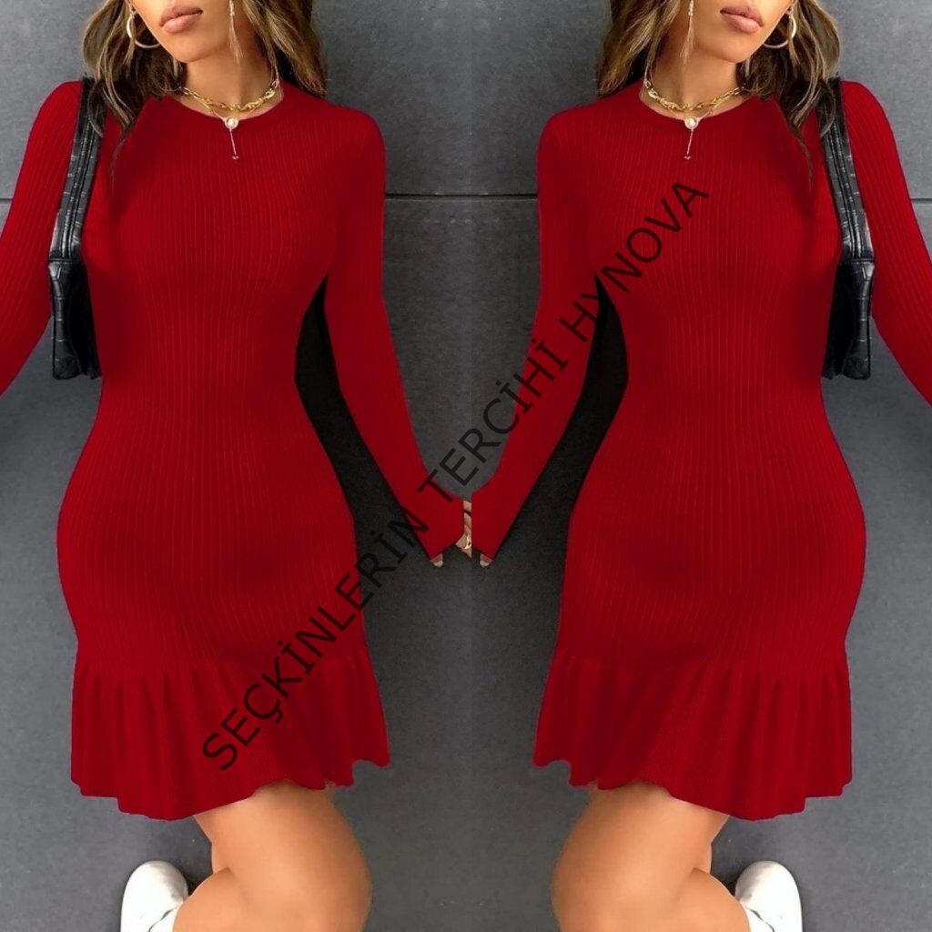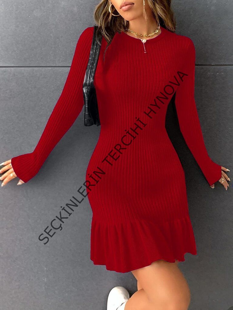 Kadın Bisiklet Yaka Uzun Kol Etek Ucu Fırfırlı Triko (polyenit) Mini Boy Elbise