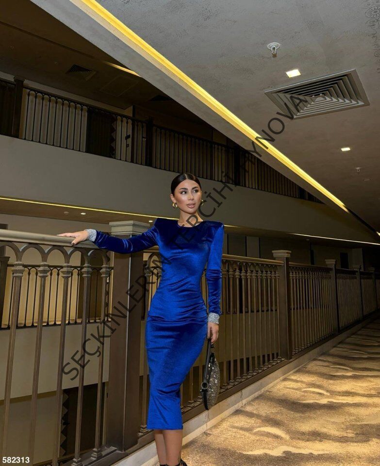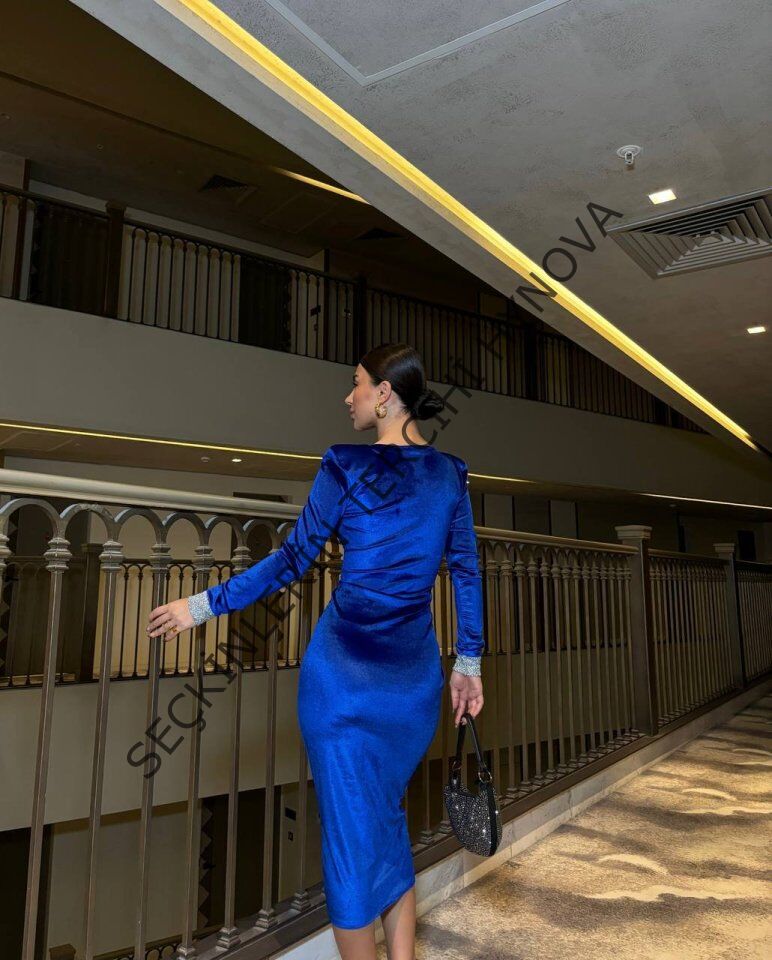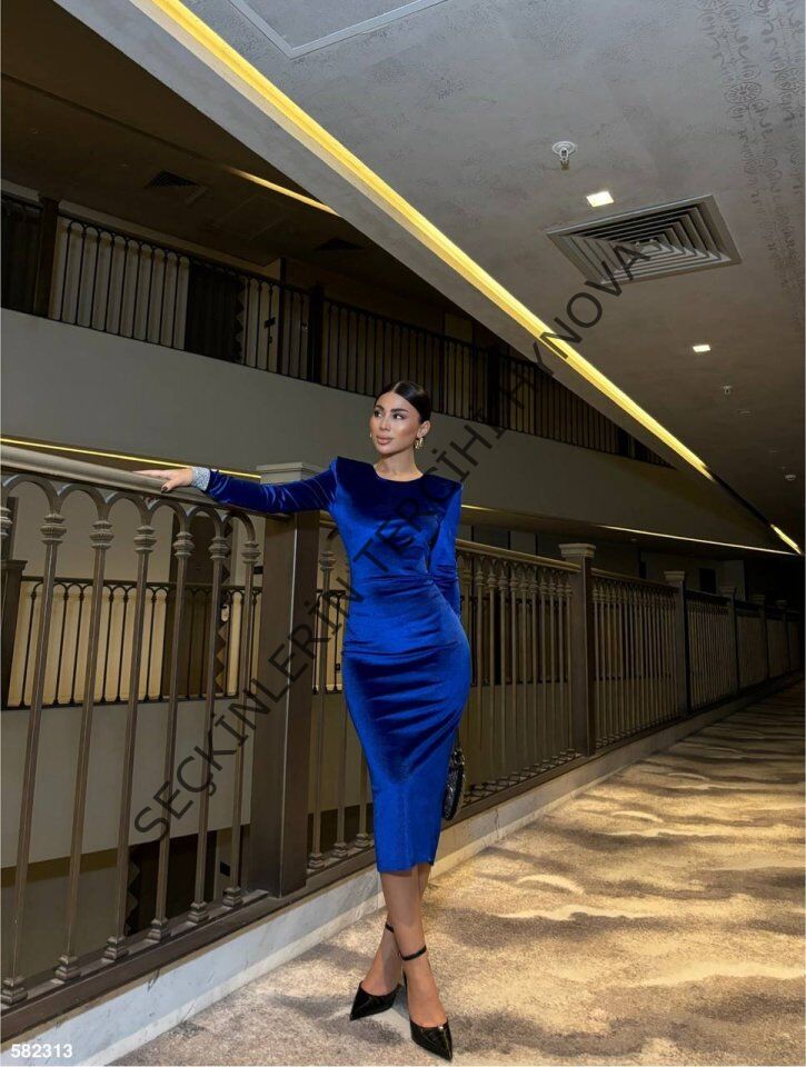 Kadın Bisiklet Yaka Vatkalı Manşet Detay Kadife Kumaş Midi Boy Elbise