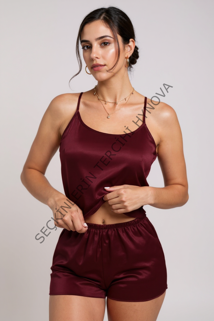 Kadın Bordo Asimetrik Sırt Dekolte Detaylı Şık Şortlu Gecelik Takım – Modern, Konforlu ve Günlük Kombinlere Uygun