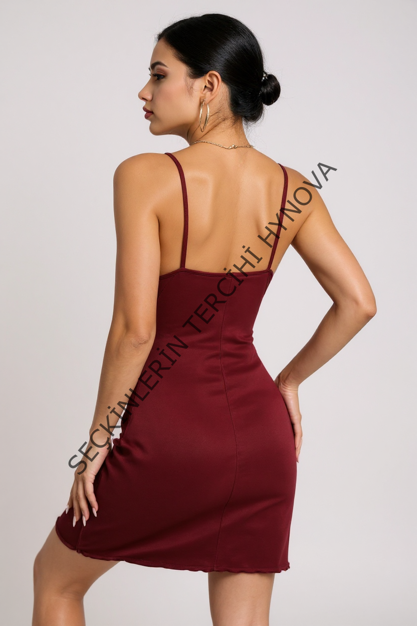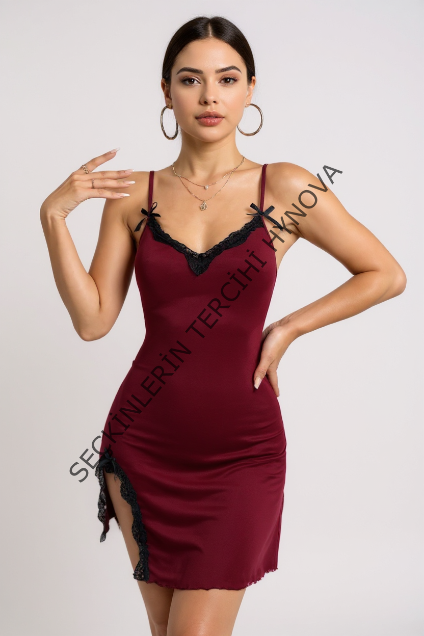 Kadın Bordo Bacak Yırtmaçlı Siyah Dantelli ve Fiyonklu Şık Gecelik – Modern ve Şık Tasarım