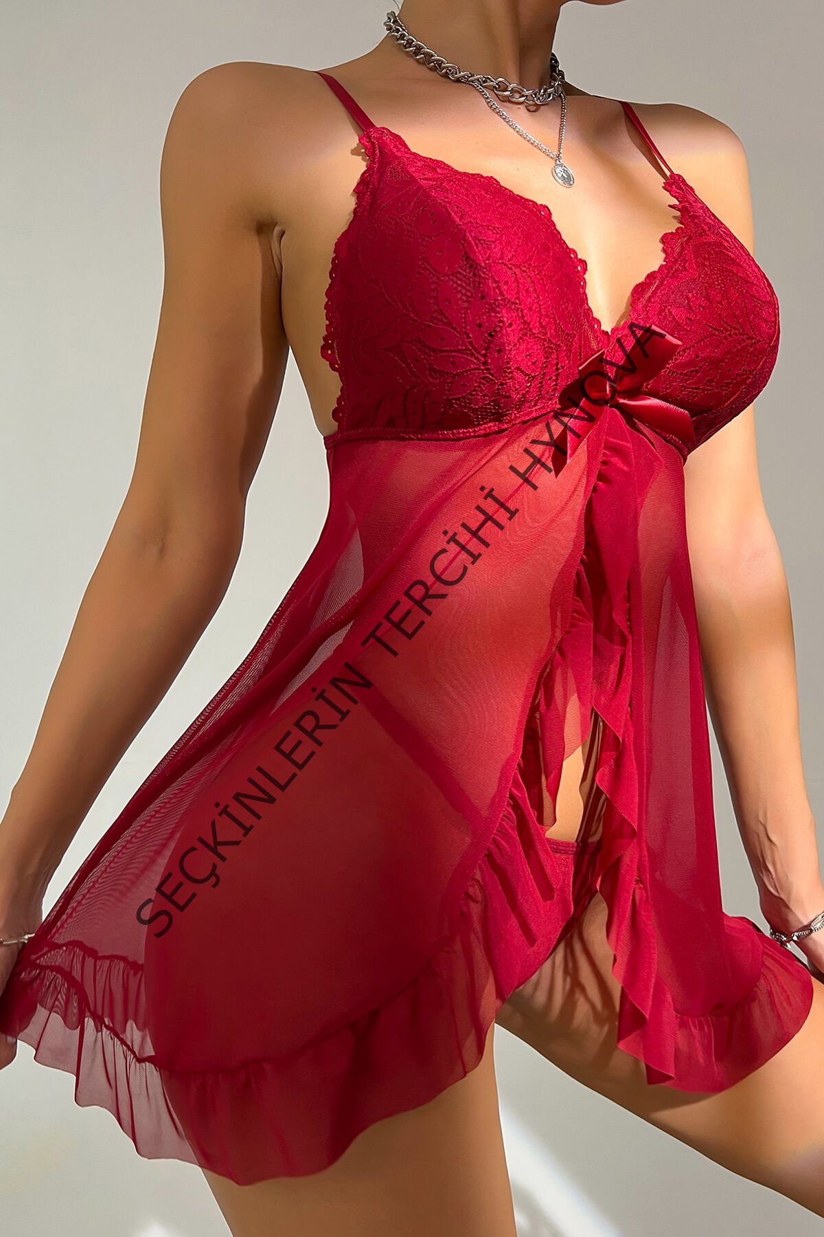 Kadın Bordo Dantelli, Fırfırlı Tül ve Fiyonk Detaylı Tangalı Gecelik Takımı