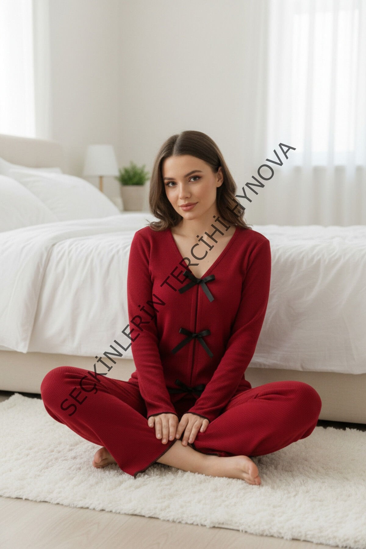 Kadın Bordo Fiyonklu İç Çamaşırı ve Uzun Kollu V Yaka Pijama Takımı 4'lü Set