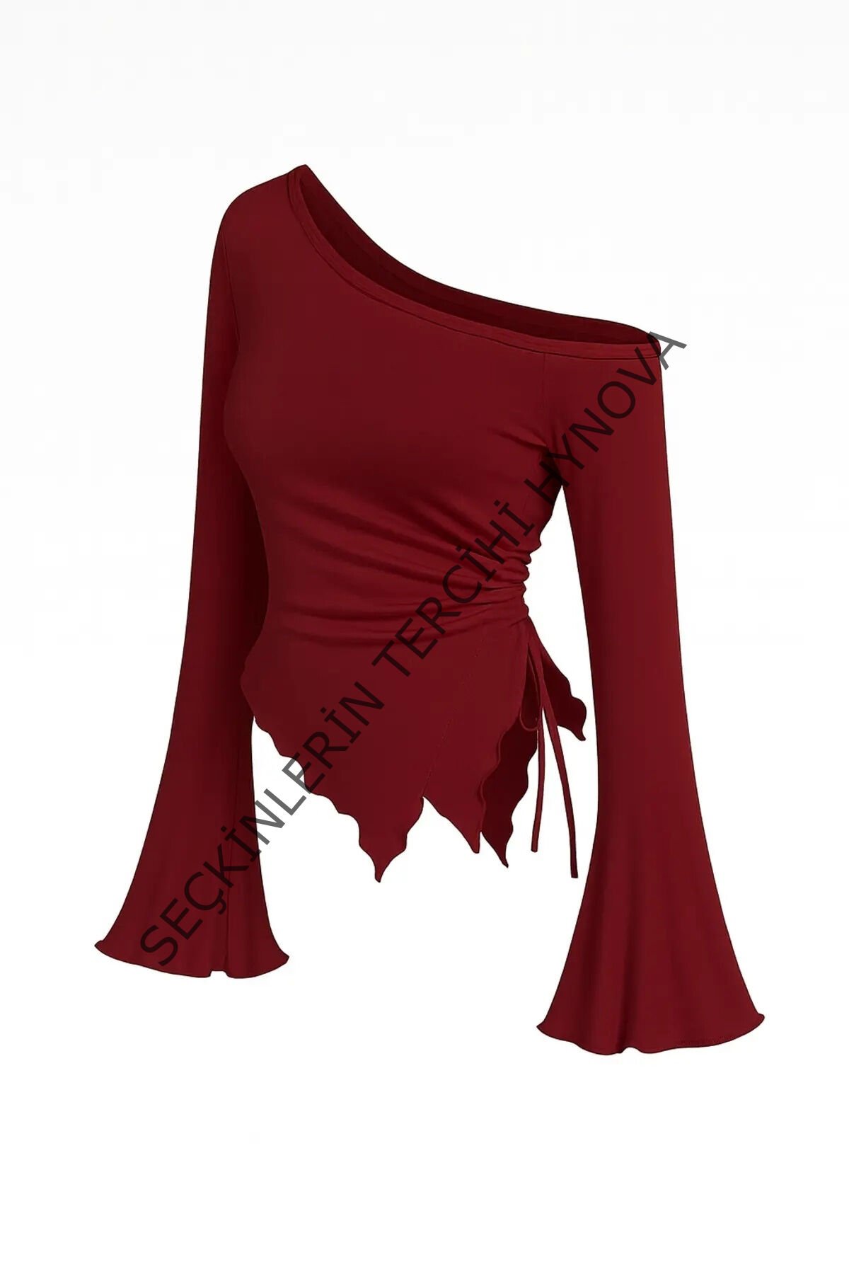 Kadın Bordo Uzun İspanyol Kollu Asimetirik Yaka Yandan Bağlamalı Drapeli Bluz