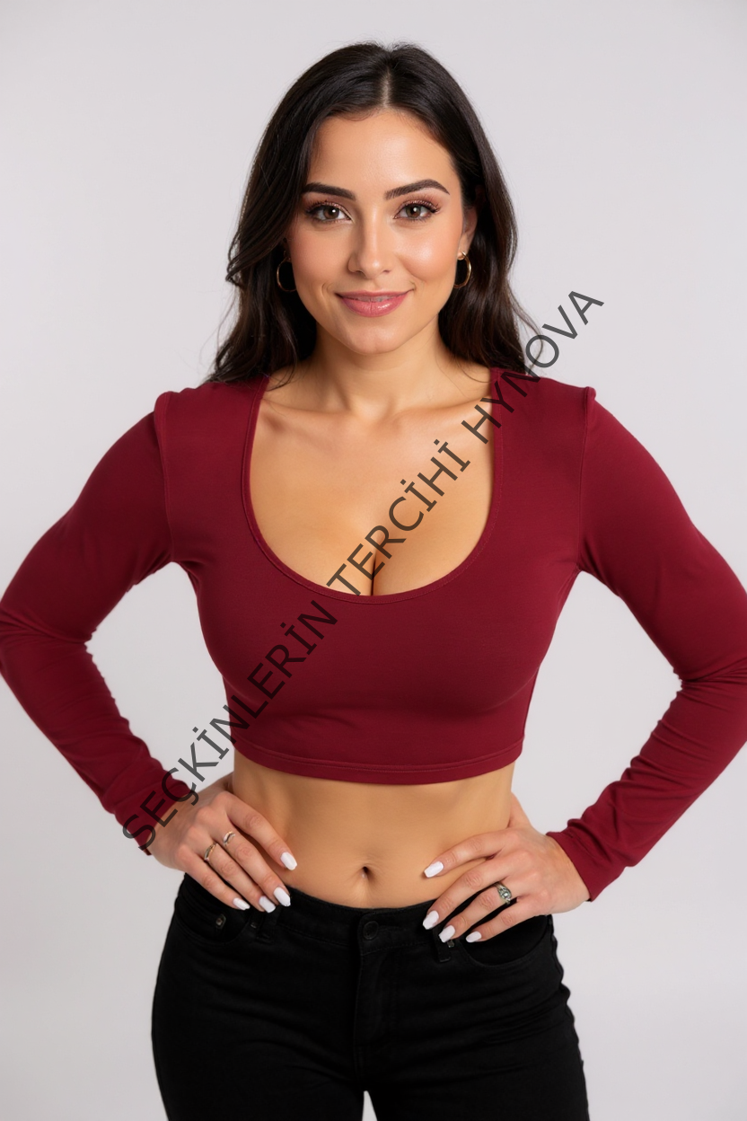 Kadın Bordo Uzun Kol Kare Yaka Crop Top Bluz