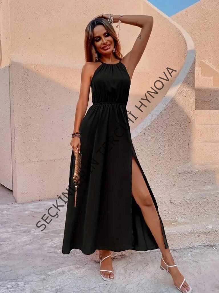 Kadın Boyundan Askılı Belden Lastikli Yandan Yırtmaç Detaylı Viskon Elbise