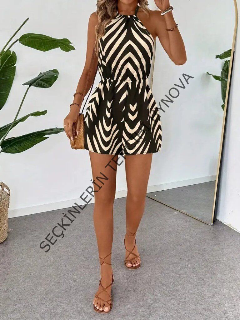 Kadın Boyundan Askılı Halter Yakalı Desenli Süprem Tulum