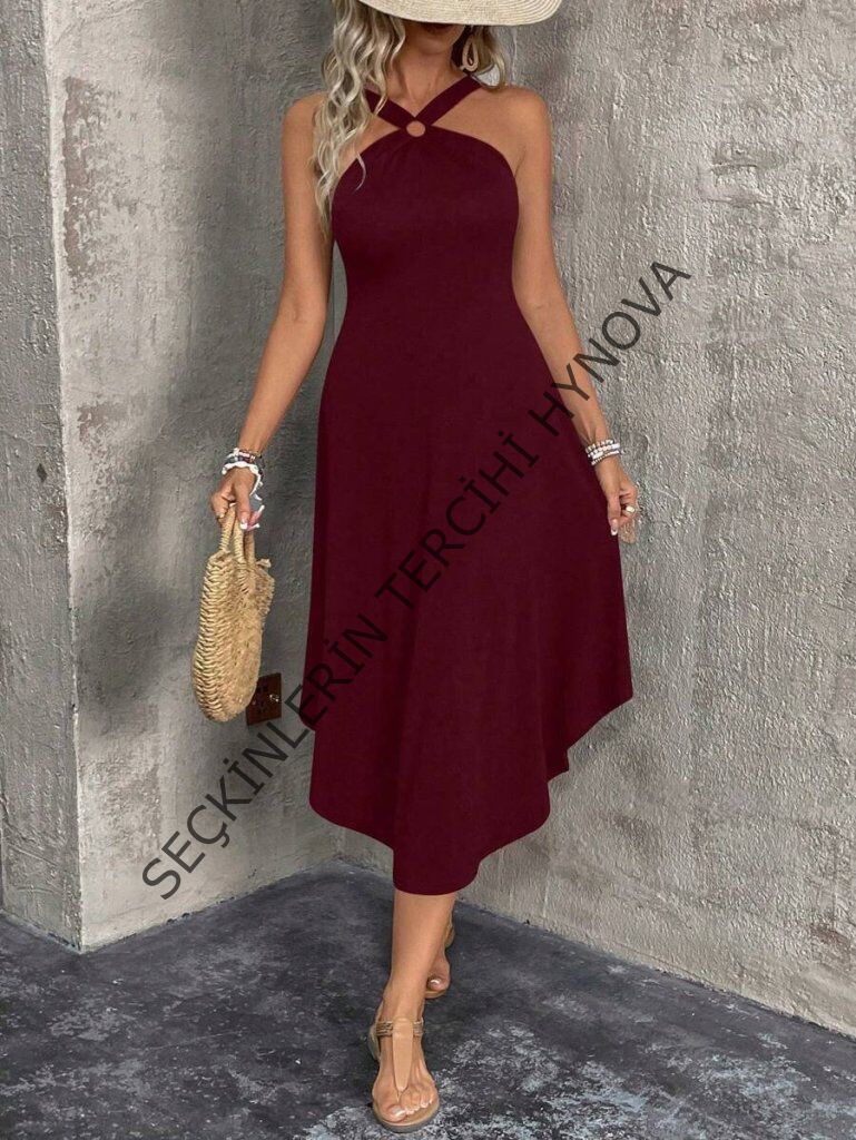 Kadın Boyundan çapraz Askılı Halka Detaylı Asimetrik Kesim Viskon Elbise