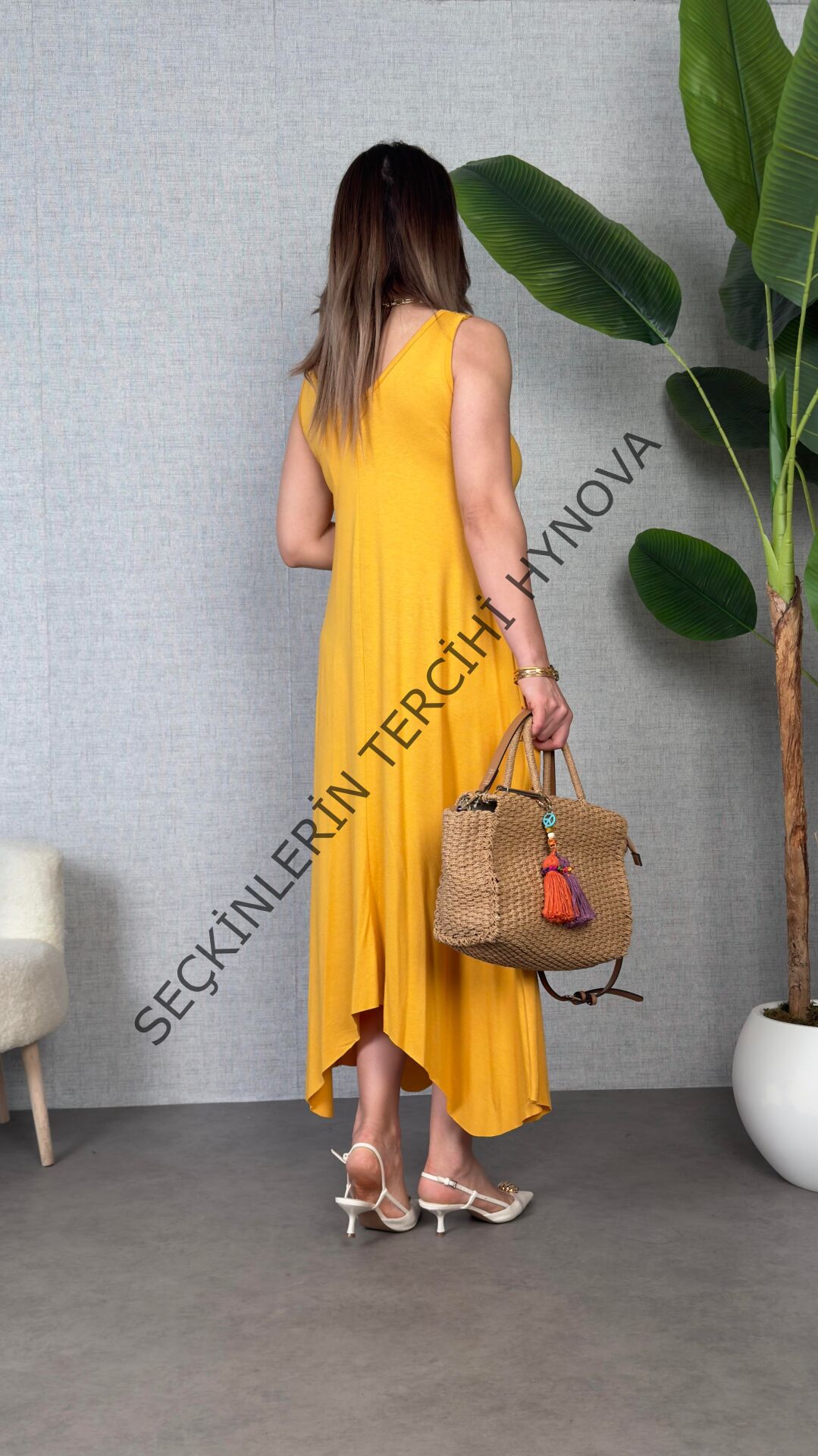 Kadın çan Dokuma Kumaş V Yaka Asimetrik Kesim Elbise