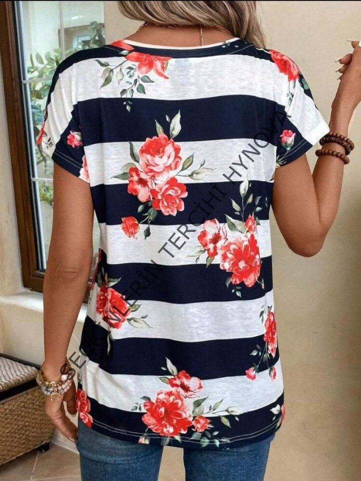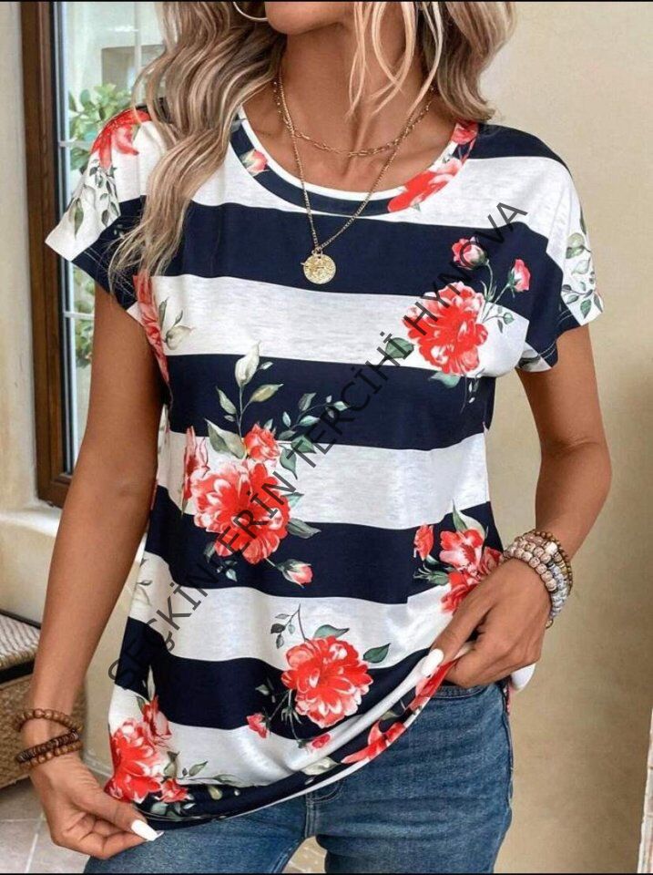 Kadın Çiçek Desenli Yatay Şeritli Bisiklet Yaka Tişört