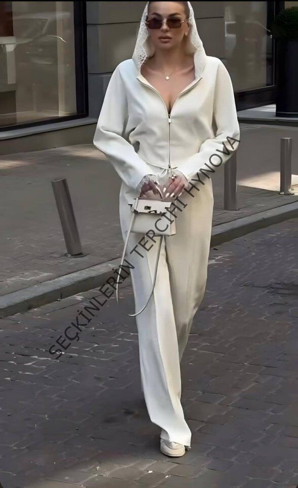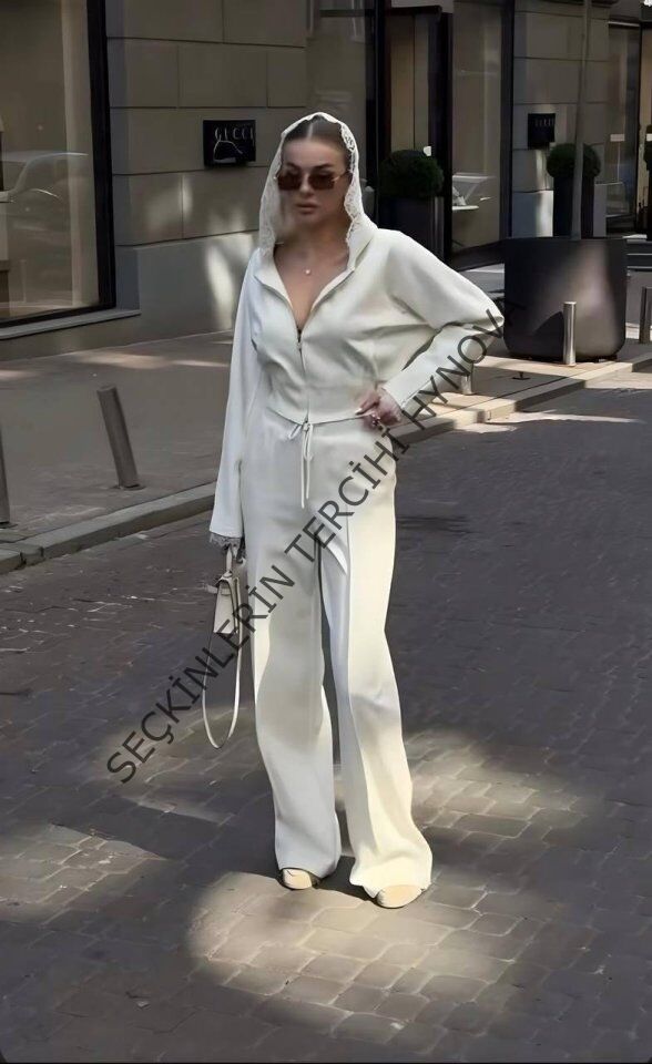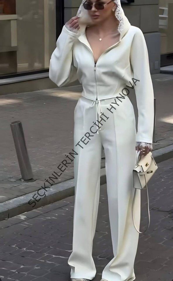 Kadın Dantel Işlemeli Kapüşon Detay Hırka Ve Ispanyol Paça Pantolon Ikili Takım