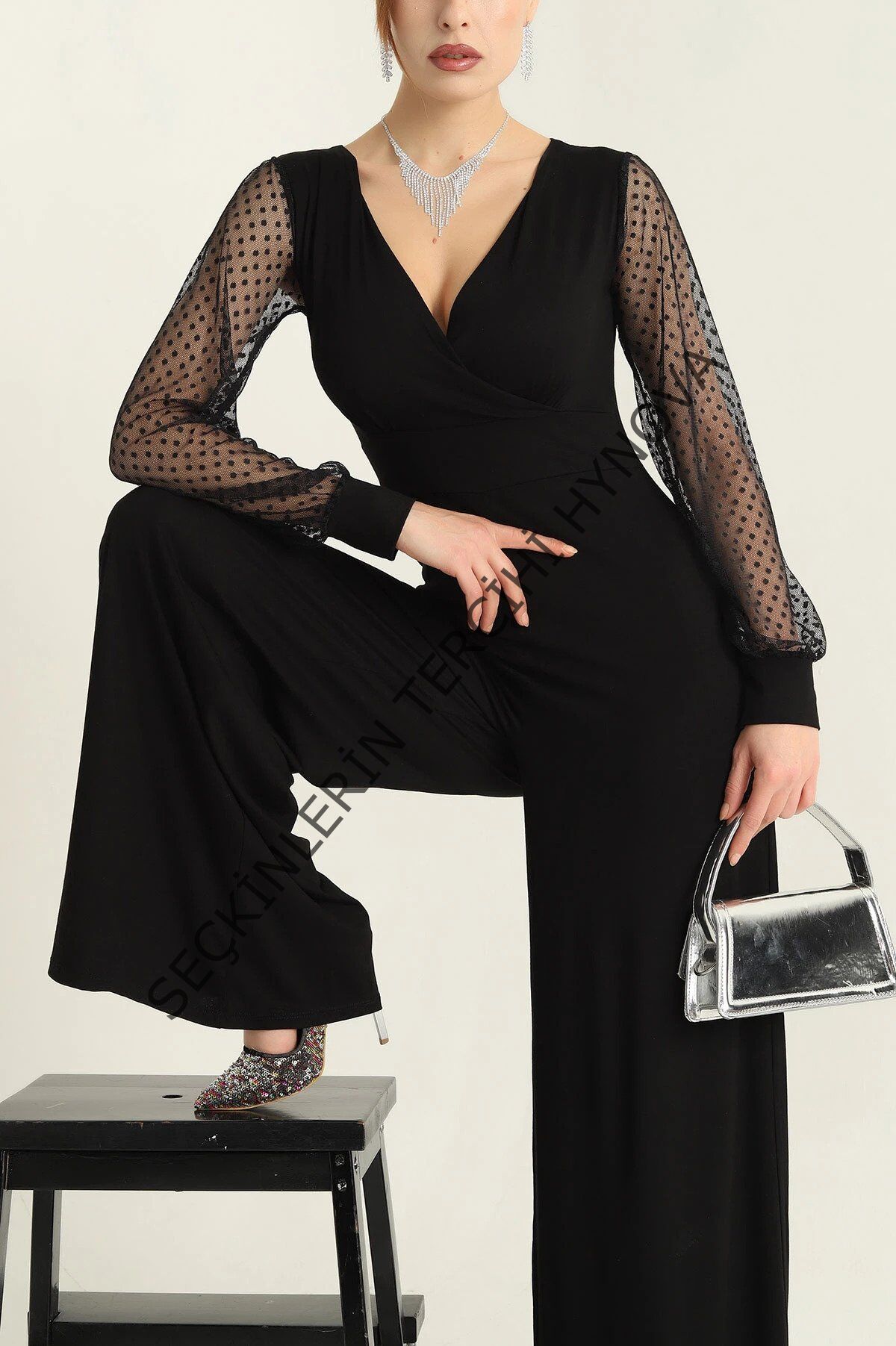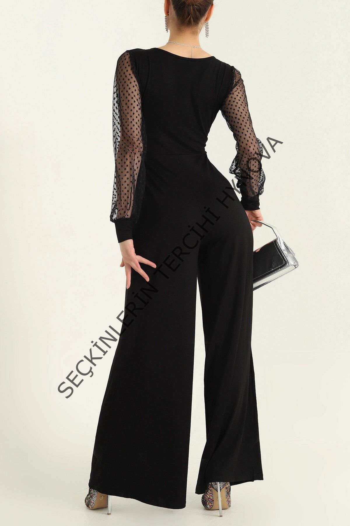 Kadın Derin V Yaka Kolları Puantiyeli Tül Detay Ispanyol Paça Tulum