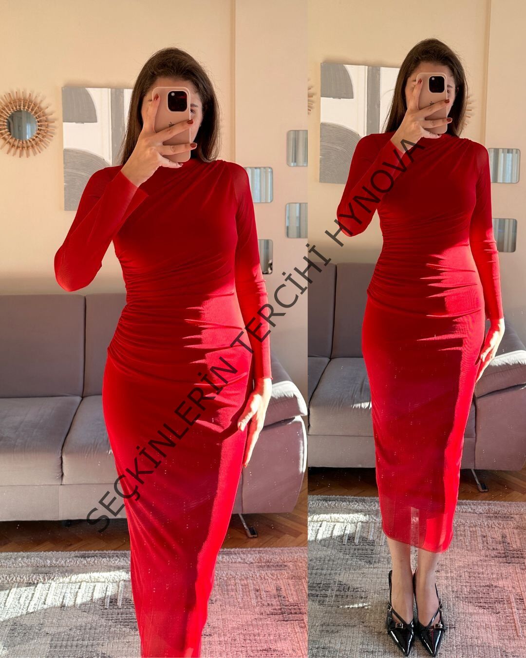 Kadın Drapeli Tül Kumaş Uzun Kollu Midi Boy Elbise